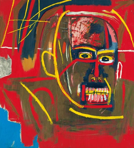 Curator: Jean-Michel Basquiat’s “Red Skull,” rendered in acrylic, startles with its primal energy. The date, 1982, places it squarely within his peak period. Editor: It feels immediately visceral, doesn’t it? Almost aggressively so. The chaotic composition and intense reds convey a sense of raw anxiety, of an urgent scream trying to break through. Curator: Skulls, of course, are potent symbols across cultures, embodying mortality, transition, and the ephemeral nature of existence. Consider how Basquiat reclaims this universal imagery through a modern lens, layering it with his signature neo-expressionist style. The marks of struggle and vitality commingle here. Editor: Right, but I also read the "Red Skull" figure in a deeply political way. It is not just an individual grappling with mortality. Look at the historical moment – the 1980s, the rise of Reaganomics, stark racial inequalities. The skull here feels like a visceral representation of systemic oppression, a symbol of the walking dead created by uncaring structures. Curator: An interesting viewpoint. I can agree with the overall symbolic meaning, it could easily symbolize a type of decay inherent to our society and humanity as a whole. Basquiat masterfully blends high and low art references to forge his unique symbolic order; the graffiti elements tie this piece firmly to street culture, which can have revolutionary and freeing connections to a lot of folks. Editor: Absolutely, and I think it is critical to remember Basquiat’s positionality as a Black artist in a predominantly white art world. His choices – the subject matter, the style – are all acts of resistance, of reclaiming space. So this skull screams in defiance. Curator: Yes, it challenges us to remember cultural continuity through symbols. The skull form stretches back millennia, finding resurgence in various resistance movements, but Basquiat uses a visual language that can reach us on different plains of consciousness, sparking connections we may not always grasp fully. Editor: I agree. By juxtaposing that ancient, ever-present symbol of mortality with the frenetic energy of the New York art scene, Basquiat forges a new language, that still resonates loudly with social unrest even today. Curator: It's precisely this synthesis that makes "Red Skull" such a compelling piece; timeless yet timely, deeply personal, but universally resonant. It asks, maybe even demands, that we grapple with life, death, and meaning. Editor: Leaving you little chance of quiet introspection. It grabs your attention in a bold and unavoidable way and compels the audience to deal with questions of injustice and death. A truly amazing piece.