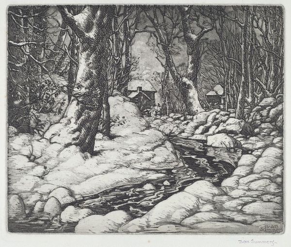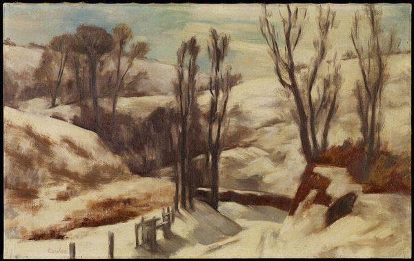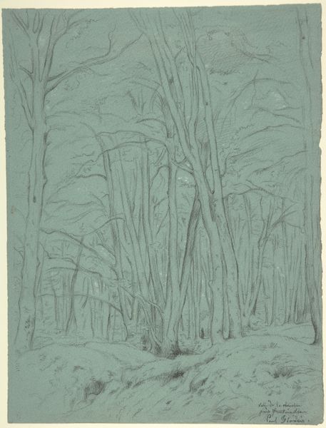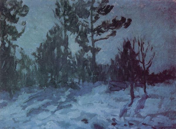Curator: Before us is Eero Järnefelt’s “Trees in Winter,” created in 1915 using colored pencils. Editor: A very delicate thing, isn’t it? Like a memory fading at the edges. The paper itself has an almost textile-like quality, drawing me right in, against the desolation it tries to convey. Curator: Absolutely, the texture is quite captivating for what we often relegate to just "drawing." I think it hints at the broader artistic debates of the time. Järnefelt was working in a period when the lines between fine art and craft were actively being questioned, even blurred. Think about it: what does it mean to painstakingly create this scene with, essentially, fancy crayons? Is that “lesser” somehow than oil on canvas? Editor: Precisely! And looking closer at these specific materials: What sort of colored pencils were available in 1915 Finland? Were they mass-produced, or handcrafted somehow? The piece prompts so many questions about its making. Also, I can’t help but notice the symbolism tucked inside, almost an anthropomorphic quality given to those central trees; the way their branches meet at the top...almost heart-shaped! Curator: Yes, I do believe it flirts a bit with symbolism, nudging beyond mere landscape representation toward a more emotive experience, of harsh conditions perhaps endured, maybe love! And look at the layers of colour Järnefelt coaxes out of those pencils – that luminous blue in the background sky contrasted against the browns and blacks. The color evokes a sense of calm and frozen wonder! Editor: And those shadow marks scratched on the snow with colored pencils – an excellent representation of the frigid breeze rippling over that surface! It's quite visceral, in the best way, almost making my skin crawl. Järnefelt used a very basic, even pedestrian medium, to conjure some powerful responses, for sure. Curator: Agreed! The image rewards slow, deliberate observation. Even in its muted palette, there’s a silent vibrancy, the winter scene coming alive by the layering of color over form. Editor: So it invites contemplation...both of what is represented, of the how of it's represented. So, well-worth the second look then, that it demands.