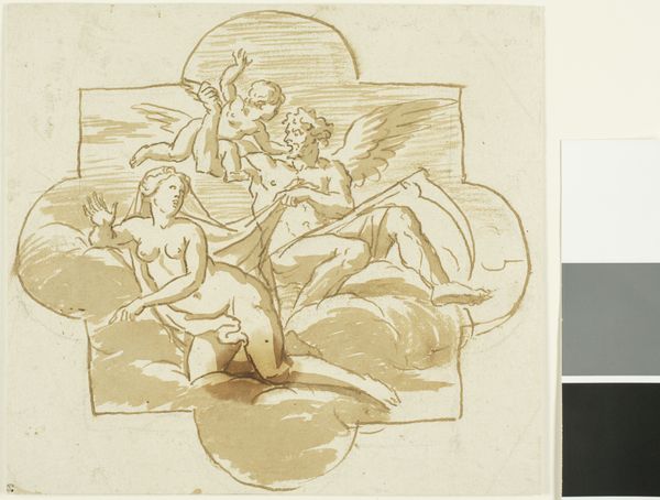 Curator: Looking at this delicate watercolor drawing titled "The Dream of Aeneas" by Théodore Géricault, one is struck by the apparent dichotomy between classical subject matter rendered in the Romantic style. What are your first thoughts? Editor: There's a strange stillness about it, almost as if caught between waking and sleeping, amplified by those washed tones and the slightly unfocused lines. Curator: Géricault uses watercolor, a relatively accessible and easily transportable medium, which suggests the piece might have been produced outside a studio, perhaps in a more immediate, informal setting. The materials themselves speak to a certain portability, contrasting with the grandeur of the subject. Editor: Exactly. I am particularly drawn to the figure looming in the upper right corner – appears to be a god or some sort of guiding spirit. Their gesture feels both protective and urgent, as if they are steering Aeneas toward his destiny. Notice the reddish hues that surround him, lending an almost ethereal quality to their presence. Curator: The artistic process and the choice of material seem crucial here, pointing toward a certain democratizing impulse, perhaps even prefiguring later movements. We must also consider the labor involved: watercolor being, unlike oils, a difficult medium for corrections... the marks show a sense of planning but allow accidents in color as well, very distinct from the way that Romantic paintings would usually have been worked on. Editor: Indeed, looking closely, the sword at the foot of Aeneas's bed also tells a story. The prominent positioning of that sharp blade and armor—these items remind us of his warrior identity but in sharp contrast with Aeneas as a sleeping figure, revealing the mental strife of the leader and human being behind. Curator: Precisely. That position reflects Géricault’s innovative method to connect mythology with a real understanding of labor and its products. A close look at the drawing supports an examination of its making in light of social considerations about myth making, propaganda and human agency. Editor: Thinking about the classical allusions together with the visual symbols that bring history into play like those pieces of armor, it brings depth that surpasses only aesthetic evaluation. It feels like engaging in dialogues across historical periods and even internal human realms of waking life and subconscious motivation. Curator: An important reminder that engaging with art necessitates engaging with ideas that touch both craft and symbolism... food for thought. Editor: Absolutely. A fulfilling reminder to appreciate how cultural context permeates everything, regardless of style.