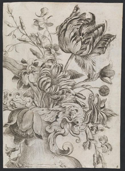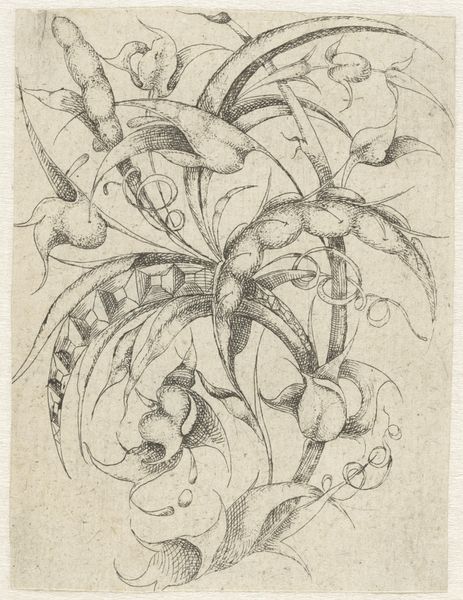 Curator: Well, what a curious drawing. Looking at this, we have what is known as "Klein edelsmidboeket met edelstenen" created circa 1620 to 1625 by an anonymous artist. It is an engraving and print on paper. And you, what are your first impressions? Editor: Kind of chaotic! There’s a nervous energy in the lines. It feels less like a bouquet and more like… some kind of organic puzzle. Very busy, but the stark black and white is definitely compelling. Curator: That nervous energy is quite perceptive. Pieces such as this were models that goldsmiths would use as inspiration in the design and manufacture of jewelry. The lines of engraving demonstrate form; consider geometric, baroque style, with small lines for shadowing that gives the overall object depth and form. Editor: Ah, so it's like a baroque mood board! That explains the, let’s say, "enthusiastic" detailing. I get this image in jewelry form, glinting under candlelight. So, if this helped a goldsmith conceive a beautiful piece, what do the distinct forms communicate? Curator: There's a cultural language in these details. These small lines are part of a greater visual lexicon. Geometric and curvilinear forms communicate the prosperity of the patron and artistic prowess and discernment of the goldsmith, but perhaps this could be further expanded. What emotional or psychological states are brought to mind when viewing? Editor: I'm still stuck on the chaotic energy. The jewels become almost like thorns. Wealth intertwined with anxiety. Curator: That interpretation aligns with the socio-economic instability of the Baroque era. The symbolism conveys a deeper awareness, reflecting a world in flux, mirroring individual experience with collective anxieties and expectations. Editor: It's interesting to think something intended to bring visual pleasure could have such complex emotions interwoven into its design. Well, I can never look at a brooch the same way! Curator: Precisely. Visual art provides cultural memory. Thanks for joining me to discuss and explore this drawing's various facets and meanings.