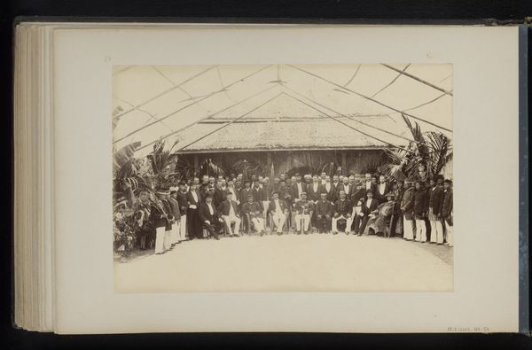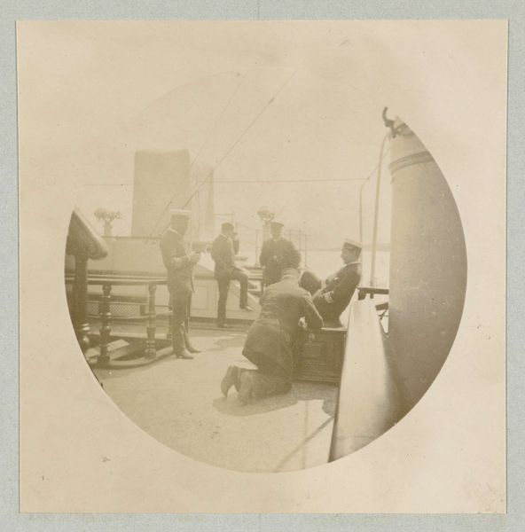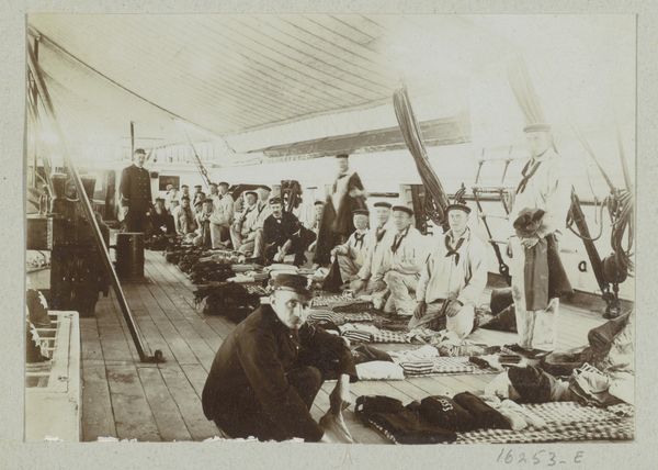 Editor: This photograph, "Groep leden van het Amsterdamsch Studenten Corps aan tafel op een rondvaartboot," was taken around 1897 by Nicolaas Schuitvlot. It pictures a group of students on a boat. What strikes me is how staged and formal it seems for a candid moment. What's your read on this image? Curator: As a materialist, I’m interested in understanding how the technology and production of photography shaped such images. The limitations of photographic processes in 1897—exposure times, equipment bulk—would have made a truly candid shot like this exceedingly difficult, influencing the mode of representation towards portraiture. These weren’t spontaneous snapshots in the way we understand photography today. Editor: So the technology directly impacted the image itself. It's less a window onto a real moment and more a… performance? Curator: Precisely. The production of this photograph relies on very specific material conditions. Silver halide chemistry, glass plate negatives, and the cumbersome equipment dictate the style and the labor of photography itself becomes evident in the image. Even the clothing of the students - those formal suits! - point to material production and economic status as a performative aspect in image creation. Editor: I hadn't thought about that before. So, seeing this through a materialist lens, it’s not just a record of a group of students, but a complex layering of technology, economic status and even physical labor of making the picture. Curator: Absolutely! And it forces us to consider who had access to these technologies and to explore how the distribution and consumption of such images reinforced social hierarchies. Photography was never a neutral observer. Editor: Wow, that gives me a whole new appreciation for it. Thank you. Curator: Likewise. Examining materiality gives us insight into even overlooked facets of visual media.