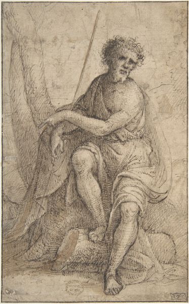 Editor: This is an interesting preparatory drawing from the 15th century. It's called "Study of a Seated Mannequin with an Arrangement of Drapery, for a Figure of the Virgin," done by an anonymous artist, using pencil. The unfinished quality gives it such a raw and immediate feeling. How do you interpret this work? Curator: It's compelling, isn't it? I see a careful layering of meaning. This 'mannequin', seemingly devoid of emotion in its sketched facial features, paradoxically embodies deep cultural significance. Look at the drapery – these are not random folds, but echoes of classical sculpture, loaded with connotations of piety and grace. Even the seated pose itself carries symbolic weight, hinting at humility and contemplation, virtues deeply associated with the Virgin. Editor: So, the drapery and pose are important visual cues? Curator: Precisely. Artists then weren't simply representing what they saw; they were fluent in a visual language. Each line, each fold, contributes to the cultural memory surrounding the Virgin, a figure understood across generations. Ask yourself, what feelings do those cascading lines evoke? Editor: I suppose I see a sense of solemnity. The weight of the fabric is almost… sorrowful. Curator: Indeed. Even though the artist is using a 'mannequin,' the aim is to access and convey emotions through familiar visual metaphors. The incomplete nature even adds to its power - the creative process laid bare, allowing us a glimpse into the formation of an iconic figure. Editor: It's fascinating how a seemingly simple sketch can hold so many layers of meaning and intention. It really shifts my perception of what these early Renaissance artists were trying to achieve. Curator: It reveals their depth of engagement with imagery - as well as how, even in preparatory sketches, they were thinking in symbolic and deeply meaningful terms.