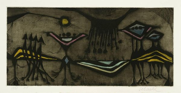 Curator: Anne Ryan's print, "Figures in a Yellow Room," presents us with abstracted forms in a surprisingly intimate setting. Editor: My immediate reaction is one of tension. The angular forms and stark color palette feel unsettling. Curator: That tension, I think, speaks to the psychological weight of interior spaces, particularly the symbolism of the "yellow room" which evokes themes of illness, confinement, and altered perception, a common thread in late 19th and early 20th century literature and art. Editor: The composition is certainly deliberate. The negative space between the figures creates a palpable sense of separation. The yellow backdrop is so aggressively frontal, it almost flattens the picture plane. Curator: Precisely. It's as if the figures are trapped within the room's symbolic framework. Editor: Ultimately, the success of the artwork relies on the skillful execution of line, color, and the deliberate placement of forms, drawing me into its strange pictorial logic. Curator: I see it as a reflection of internal states made visible, drawing upon cultural memory. Intriguing.