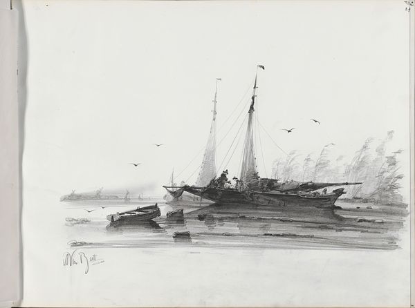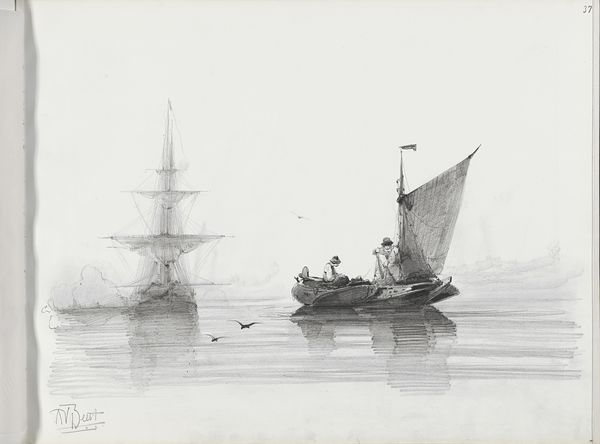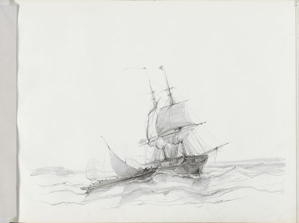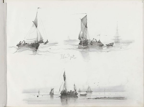 Albertus van Beest made this sketch of two sailboats with figures on the water using graphite. Van Beest was primarily a marine painter, a popular genre in the Netherlands that coincided with a period of Dutch maritime power. Here, the artist captures a slice of everyday life on the water. By the 19th-century, images of labor and leisure became popular subjects for artists as the Industrial Revolution progressed and class distinctions became more pronounced. The figures on the boats appear to be working, perhaps fishing, which suggests a narrative rooted in the laboring class. The rough sea, economically rendered with strokes of graphite, adds a sense of realism, reminding us of the unpredictable and often harsh conditions these workers faced. The neutrality of the graphite underscores the quiet dignity of labor, portraying a serene, if understated, view of maritime existence. This drawing invites us to reflect on the relationship between labor, identity, and representation.