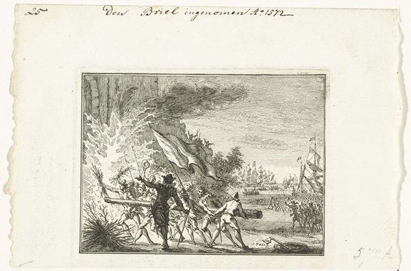 Here we have Jacobus van Meurs' etching from 1800, titled "Schatzoekers van Muiden," a depiction laden with symbolism. Observe the central cross—a universal symbol of faith and suffering. Here, it stands over supine figures, perhaps mirroring scenes of lamentation found in countless Deposition artworks. The kneeling men, heads bowed, echo postures of grief and supplication seen across cultures. Consider the motif of buried treasure itself, a recurring theme from folklore to literature. It taps into primal desires for wealth, power, and immortality, reflecting our collective hopes. The treasure, in its hiding place, becomes an object of intense psychological projection, embodying our deepest desires and fears. See how the image's stark contrast and composition evoke a sense of unease and mystery, engaging us on a subconscious level with timeless, primal narratives. These symbols don't exist in a vacuum, their meanings have evolved through a continuous process of cultural transmission and adaptation.