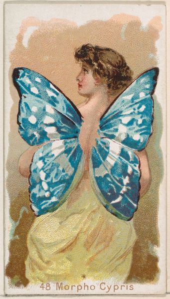 Card 45, Urania Rhipheus, a chromolithograph, was part of the Butterflies series distributed by the Wm. S. Kimball & Co., a tobacco company. These cards, a form of early advertising, reflect the Victorian era's fascination with natural sciences, combined with an idealization of femininity. This card features a woman with butterfly wings. Here, the female form is merged with the natural world, reminiscent of mythological figures and fairy tales that often served to both empower and constrain women within specific cultural narratives. There is an emotional ambivalence that comes with this piece. Is this woman becoming an exotic creature, or is she being reduced to one? The act of associating women with delicate, aesthetic qualities, as seen here, served to reinforce societal expectations of women as objects of beauty and fragility, which obscured the complex realities of women's lives. This card reminds us to consider the nuanced ways in which images shape our understanding of identity and the world around us.