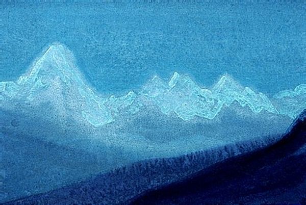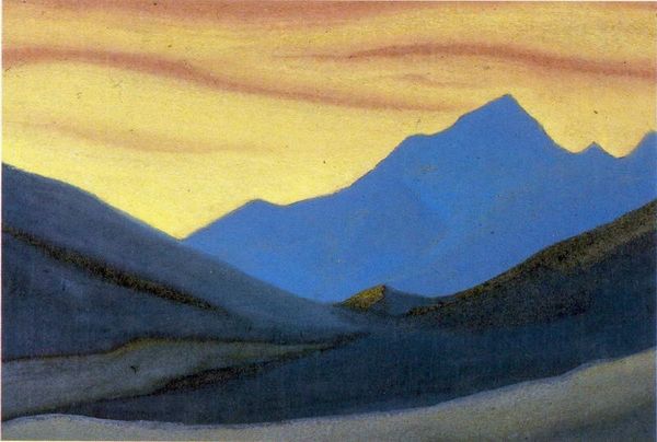 Editor: Here we have Nicholas Roerich's painting, Himalayas, done in tempera. It's so serene and… distant. What do you see in this piece? Curator: I see a fascinating engagement with materiality and the construction of the "Orient." Roerich employs tempera, a humble material with historical ties to icon painting. Considering his interest in Eastern spiritualism, does this choice undermine or reinforce the image of the Himalayas he constructs for Western consumption? Editor: I hadn't thought of that. It's interesting that he chose a more "humble" medium to represent such a grandiose landscape. Is it then more about the production and distribution of such images than capturing the true essence of the landscape? Curator: Precisely! Think about how the painting circulates – as a readily reproducible image. Tempera allowed for quicker drying and efficient production. This facilitated wider distribution, influencing popular understanding and potentially commodifying a spiritual place for a Western audience. How does the act of painting the Himalayas, transforming them into a transportable commodity, affect our relationship with this landscape? Editor: So it’s not necessarily about an accurate representation of the Himalayas, but more about how it functions within a system of artistic production and consumption? And tempera supports that end? Curator: Exactly. The means of production – the use of tempera, the potential for mass distribution – directly shape our understanding and engagement with the subject matter. It allows for accessible creation but can change the cultural appreciation. Editor: This definitely makes me consider art's impact differently - looking at it in terms of materiality. Curator: Me too! It's crucial to consider how an artist's choice of materials implicates both creation and distribution.