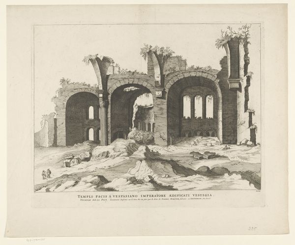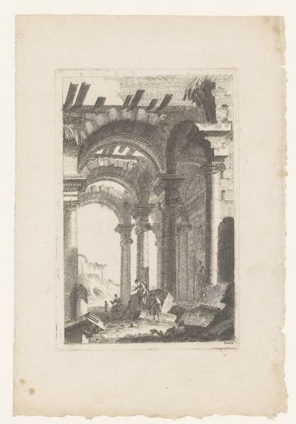 Editor: This is Giovanni Battista Piranesi's "Temple of Juno Regina, now Church of S. Angelo in Pescheria," an engraving from between 1741 and 1748. There’s a melancholy feel to it, seeing these grand ruins overtaken by…well, everything. What do you see in this piece? Curator: I see a potent commentary on power, time, and the ways societies repurpose history to serve their present needs. This print isn't just a picturesque depiction of ruins; it’s an interrogation of the very narratives we construct around civilization and decay. Consider how Piranesi, through his dramatic use of light and shadow, emphasizes the co-existence of the ancient temple dedicated to Juno Regina and the superimposed presence of a church. What does it mean when a sacred space dedicated to a powerful Roman goddess is literally consumed and replaced by a new religious structure? Editor: I hadn't thought about it like that. So, it's not just a depiction, but more of a…critique? Curator: Precisely. Piranesi asks us to confront the layers of power embedded within the landscape. He uses architecture to reveal how dominant ideologies write themselves onto the world. And more so, challenges us to consider how these imposed narratives impact marginalized groups or displaced belief systems, and the social repercussions of cultural shifts. Can you imagine what communities once centered on the worship of Juno thought about this visual erasure of their history? Editor: It's thought-provoking. Seeing it as a study of repurposed space and imposed power dynamics changes the way I understand the print completely. Thank you. Curator: And thank you. Considering art through the lens of intersectionality always brings a richer understanding, for all involved.