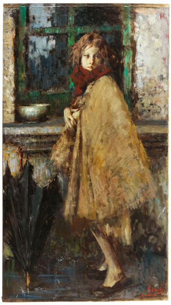 Curator: This is "Standing Arab Woman" by Edwin Lord Weeks, an oil on canvas painting presently held in a private collection. Editor: Right away, the vibrant yellow ochre just leaps out. The woman seems to glow against this muddy, almost dissolving background. Curator: The composition clearly places emphasis on the interplay of light and shadow. See how Weeks uses broad, gestural brushstrokes to capture the folds of her robe and the nuances of her complexion. The brushstrokes themselves seem more evocative than descriptive. Editor: Absolutely. There’s this beautiful looseness about it. It feels unfinished, in the best way, like capturing a fleeting moment. I am curious what she’s looking at and what is beyond the canvas; the dark hues give her space a surreal quality. Curator: The pose and subject evoke elements of Orientalism, but Weeks' style and material concerns seem foremost here. Her gaze does direct ours to a darkness or a concealed setting of space that is rendered abstract. Editor: "Orientalism" can be a problematic term. Does it flatten her experience, viewing her through a Western lens? Curator: A pertinent question. Here the artwork's significance can be found, perhaps, in the painting's negotiation of representation, inviting reflections on how cultures perceive and depict one another. But the bold choice of colours should not be diminished: gold against the drab browns offers an otherworldly impression. Editor: I find this painting intriguing. I am mostly wondering about her story and less interested in representation. And is that the mark of an artist, perhaps? How a character springs off the canvas with mystery and intrigue, so we think we almost know the story of that figure. The brushwork only adds to her enigmatic nature. I can almost feel the rough texture of the canvas. Curator: Indeed, a certain tension arises between its representational aspects and abstract elements and in turn an artistic dialogue opens. The painting thus exists as a testament to cross-cultural representation. Editor: Exactly, Edwin's painting becomes this portal to wander off into imaginatively.
