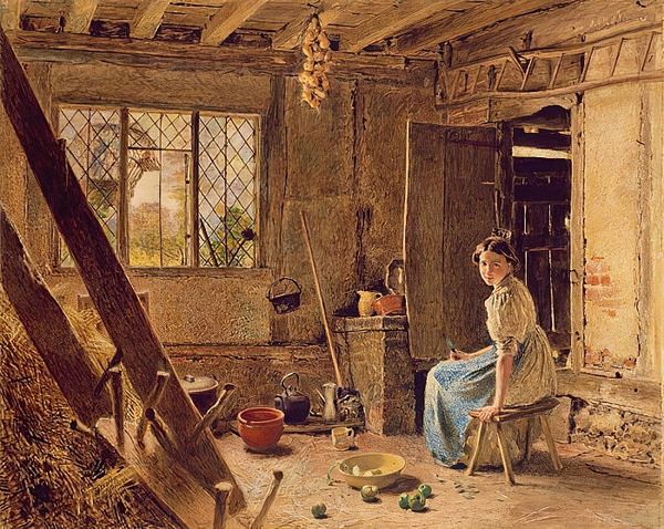 William Henry Hunt rendered "The Woodcutter's Breakfast" using watercolour on paper. The texture and colour evoke a sense of the rustic life and the interior's weathered materiality. Hunt’s construction of space is striking. The structural integrity of the composition depends on how the interior architecture converges towards the central figure, but our sightlines also diverge from him towards the window on the left. Here, we encounter the semiotics of Hunt’s arrangement. The woodcutter represents the labourer within the constraints of his domestic sphere. The window and exterior represent an outside world of possibility. This tension evokes a certain mood. Hunt creates a dialogue between the material constraints of working life and the potential for respite and reflection. The artwork becomes more than a mere scene, it opens into a meditation on work, life and the spaces we inhabit.