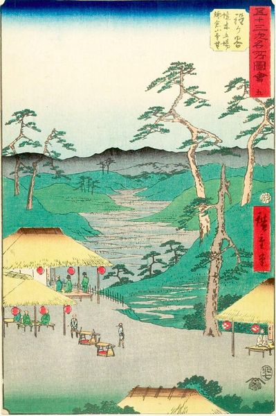 This is Futagawa, a woodblock print by Utagawa Hiroshige. Hiroshige was a master of ukiyo-e, a Japanese art movement that flourished from the 17th through 19th centuries. Ukiyo-e means ‘pictures of the floating world.’ It is worth considering what this means in the context of Japanese social history. Produced in the Edo period when Japan was ruled by the Tokugawa Shogunate, it reflects a time of relative peace and prosperity, and a growing urban culture. This print, likely mass-produced, depicts a scene from daily life. We see travelers on the road, shops, and the natural landscape. Such images were popular among the emerging merchant class. But how might this art have subtly questioned the rigid social hierarchy imposed by the Shogunate? Does the idea of the 'floating world' imply a world of impermanence, a challenge to the established order? To understand this better, one must delve into the history of the Edo period, examining its social structures, economic developments, and the role of art within it. The study of such images reveals the complex interplay between art, society, and power.