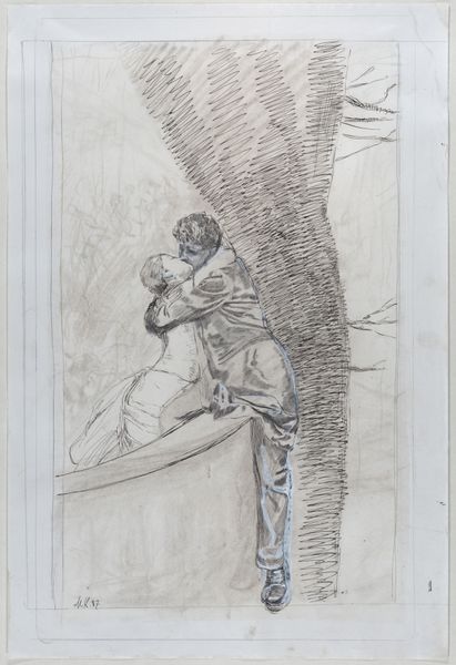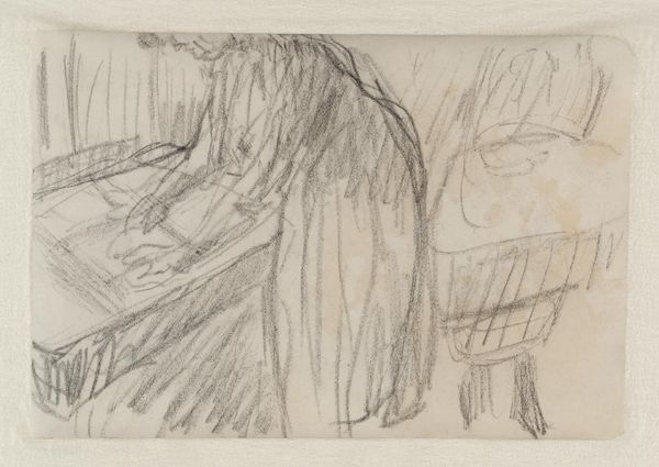 Curator: This is Édouard Vuillard's "Devant le miroir," created around 1898. It's a pastel drawing, a medium Vuillard often used to capture fleeting moments of intimacy. Editor: My first impression is a sense of quiet introspection. The soft lines and muted colors create a very serene, almost ethereal atmosphere. It feels like we're intruding on a very private moment. Curator: Exactly. Vuillard was a master of "intimism," portraying domestic scenes with a focus on mood and emotional resonance. Notice the woman’s pose; she's lost in her reflection, both literally and perhaps metaphorically. The choice of pastel certainly enhances the intimacy and delicacy of the scene. Pastels were easily accessible, relatively inexpensive and suited the quickly executed, captured moment Vuillard was aiming for. Editor: I'm drawn to the composition. The way the mirror frames the figure, echoing her shape with its curves, creates a really harmonious structure. And the stripes in her skirt provide a lovely contrast with the soft textures elsewhere. How do you interpret those formal elements in the broader context of his work? Curator: Vuillard often used patterns and textures to flatten space and create a sense of claustrophobia. It mirrors the close proximity within domestic interiors, as well as representing the rise in popularity of manufactured, patterned fabric as it entered more people’s homes. The mirror itself can be interpreted through Lacanian terms. Editor: I see. So it's not just about aesthetic appeal; the patterns reflect social realities and evolving domestic economies. The gaze into the mirror too… do you see echoes of earlier traditions or something more contemporary in his perspective? Curator: Definitely both. Vuillard was inspired by Japanese prints, with their emphasis on flattened perspective and everyday subject matter. But he was also deeply engaged with contemporary artistic movements like Symbolism, aiming to convey emotional states rather than straightforward representations. He captures modern anxieties regarding consumer culture’s increasing ability to penetrate personal, intimate space. Editor: I hadn’t thought about that layering of influences, the meeting of "high art" inspirations and more common sources available through trade and consumerism. That's really compelling. Curator: For me, it highlights how the means and the material available at hand can shape what might at first glance appear as an impressionist interior snapshot. Editor: Agreed. There’s a lot more happening beneath the surface than one first realises in “Devant le miroir."