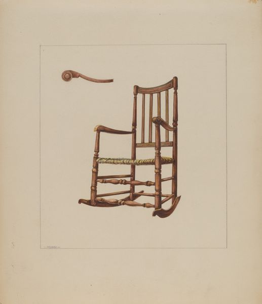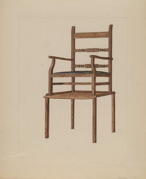Curator: Here we have Annie B. Johnston's watercolor and drawing piece, "Child's High Chair," circa 1939. What strikes you first about it? Editor: It's surprisingly somber. Even though it's a child's object, it evokes a sense of bygone eras, like a relic. Is it the starkness of the piece, or is that chair just that old? Curator: I find myself focused on the high chair itself, and what it's made from. The materials seem deliberately chosen. It appears handcrafted from roughly hewn wood, rather rudimentary; the chair itself would've been accessible even during times of relative austerity. Editor: Absolutely. I think the imagery taps into cultural ideas surrounding childhood—protection, growth. Notice how high the chair seems? Like placing the child above others in order to protect them. And the wooden bars give an implicit suggestion of security but also confinement. Curator: I agree, though I also think about the maker. Building this piece requires certain labor and resources. Its rough appearance doesn't mean lack of artistry; instead, maybe practicality born from circumstance? The craft indicates value regardless of monetary measure. Someone expended resources, skills, and labor on this single object for use. Editor: That's fascinating to think about. It shows how universal child-rearing and the desire to provide and keep one's children healthy and safe transcends time. Curator: Precisely. The worn appearance and somewhat primitive construction speak volumes about available resources, emphasizing use and practicality over ornate display. What appear now to be defects, such as exposed construction points on the legs, might reflect not lack of ability, but necessity born of circumstances, possibly an attempt to keep production costs low. Editor: Right, but there’s also that tension: a parent provides comfort with available materials and an awareness of the fragility of the human experience that such objects acquire by witnessing different moments in history and perhaps several generations using this particular seat. Curator: A fascinating look at family. The image may represent the physical necessities and their deeper resonance—material evidence of care within limiting environments. Editor: Agreed, prompting reflections on family, protection, and simple design.