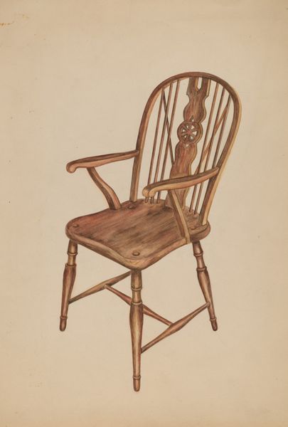 Editor: Here we have Ray Holden’s "Windsor Chair" from 1937, rendered with watercolor and colored pencil. I’m immediately struck by the simple, almost austere depiction of such a familiar object. What compositional elements stand out to you? Curator: Observe the linear elegance of the chair's back, contrasted against the more solid form of the seat. Note how the artist employs light and shadow, particularly around the legs, to create depth. Consider also the carefully chosen palette – a limited range of earth tones that focuses our attention on the structure itself. Do you notice the repetition of forms? Editor: I do! The spindles in the back, and again in the legs below, there's this echo of verticality. How does this contribute to the overall reading of the piece? Curator: The repetition establishes a visual rhythm, contributing to a sense of order and balance. It draws our eye upward, emphasizing the chair's height and perhaps even hinting at an aspirational quality, despite its humble subject matter. Look closely at the negative space, how it balances with the materiality. Editor: I hadn't considered that – the emptiness almost becomes a form of its own! So, by examining these intrinsic elements like line, light, and composition, we uncover meaning beyond just a picture of a chair? Curator: Precisely. The artist uses the visual language to elevate the ordinary, inviting contemplation of form and function in their purest states. A deeper engagement using formalist strategy moves us closer to artistic intentionality. Editor: That's fascinating! I'll certainly be looking at seemingly simple subjects with fresh eyes now. Thanks for illuminating the nuances within this everyday object. Curator: Indeed. The visual vocabulary always contains a new way of reading what lays right in front of us.