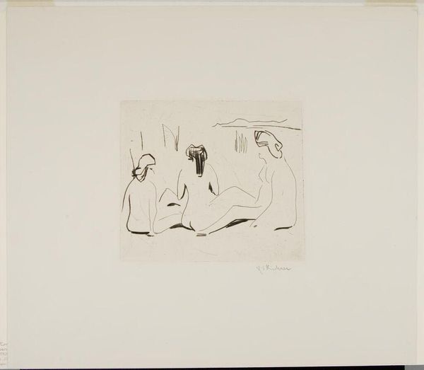 Editor: So, this is Lovis Corinth's print "Prophecy," housed at the Harvard Art Museums. It feels… heavy, burdened, like a prelude to something ominous. What do you see in this piece? Curator: Ominous is a good word. Corinth often wrestled with themes of mortality and fate. Look at the stark contrast, the almost brutal lines of the etching. It's like a premonition etched in acid, isn't it? Perhaps it mirrors his own anxieties, a glimpse into a future he couldn't quite escape. Does it whisper anything to you? Editor: It suggests a story, but one I can't quite decipher. Like a dream fading as you wake. Curator: Exactly! That elusive quality is key. Corinth offers us a fragment, a fleeting vision, and invites us to fill in the gaps with our own fears and hopes. So what prophecy do you see here?