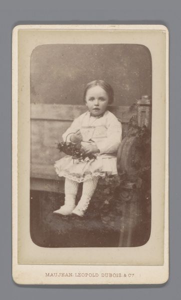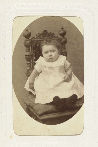 Curator: Pieter Jan Nieuwstad captured this fascinating albumen print sometime between 1905 and 1910. It’s titled "Portret van een onbekende baby op een kussen," or "Portrait of an Unknown Baby on a Pillow." Editor: It has such a poignant stillness. The way the light catches the baby’s hair and the slightly blurry background gives it this dreamlike, ethereal quality, almost like a memory. Curator: That dreamy quality could also come from the stylistic conventions around still-life photography, common around the turn of the century, often playing with softness and depth of field. But look closer: The baby isn't simply sitting. It’s positioned almost formally, on a decorative plinth with an ornate pillar as backdrop. Editor: Yes, there’s something incredibly formal about the pose. Even the lace detailing on the dress is meticulous. The softness and detail contrast in ways that draw me into the social landscape of that era. What are the clues around childhood being staged in such formal compositions? Curator: Precisely. While we may view baby pictures as informal keepsakes now, photography in the early 20th century often mirrored portraiture in painting. The backdrop and pillow become symbolic staging elements, elevating the status of the sitter, even a baby. These are documents reflecting social values around childhood and memory-keeping. Editor: The symbolic weight of "unknown," too. The title emphasizes that even as a portrait, its specificity has faded. So many unknowns become part of what it captures. We view a general experience of remembering. I also can't help but feel that pillow underneath suggests both comfort, but perhaps a sense of fragility. Curator: Absolutely. That duality, that tender-but-formal tension, gives the portrait so much evocative power, acting as a portal into early 20th-century sensibilities, familial pride, and the desire to capture fleeting moments in a lasting form. Editor: Yes, what starts out seeming like just a charming portrait actually unveils this layered complexity of class, culture, and how we navigate the human experience in its earliest stages.