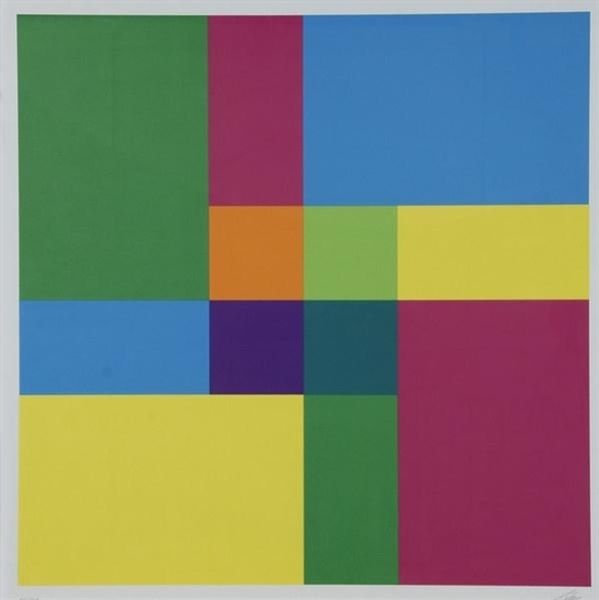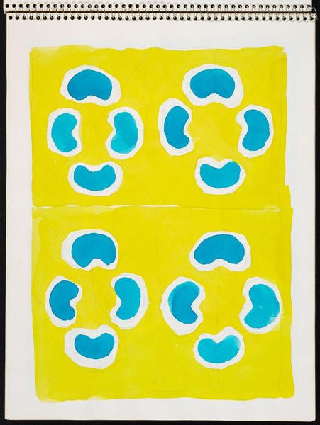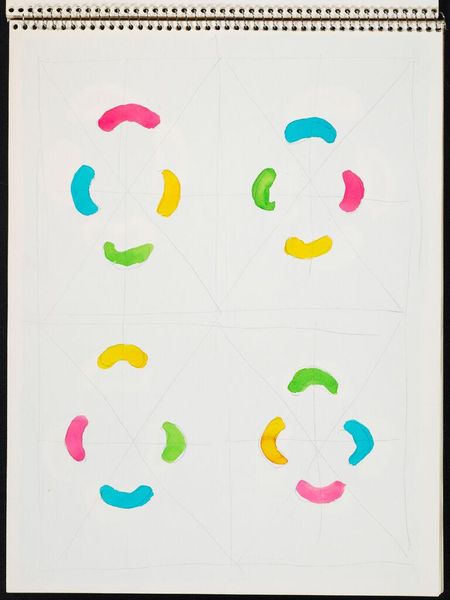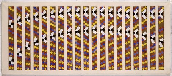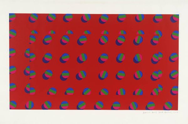 Curator: Well, hello there. Look at this: "Alhambra," a vibrant print made by Terry Frost back in 1972. It practically sings with colour. Editor: Oh, I like that! "Sings with colour" is spot on. Immediately, I'm getting this almost joyful, childlike exuberance. Like someone just discovered all the crayons in the box at once. Curator: You know, Frost was deeply inspired by places. The light, the colours. In 'Alhambra,' you see those geometric patterns—the repeating "X" or crescent shape. I believe this reflects the influence of the Moorish architecture of the Alhambra palace, especially the decoration and repeating motifs in Islamic design. Editor: Interesting that he simplifies the Moorish influence into a series of near kisses and hugs formed from semi circles. Makes you wonder about the cultural context. I’d bet that's pop art at work, translating something complex into accessible, almost graphic blocks of flat colour, but I wonder if it also downplays the deeper, spiritual side? Curator: He uses such bright, bold acrylic paints! Each square seems to have its own emotional charge. What do you get? Editor: A slight disquiet because the pattern breaks and starts again with the block arrangement; an ordered world with an undercurrent of joyful discord! Those broken geometric blocks create that almost playful imbalance to an otherwise well organised print. Perhaps that represents Frost breaking from traditional forms? Curator: The interesting question is: what IS the real order we're talking about? He has been quoted as referring to mathematics and ratios within his artworks; however, those same shapes and colours might simply be reflections on light hitting surfaces from an inspirational trip. Editor: You're right. It's the interplay, isn’t it? The structured vs. the free. Makes you keep looking to see how those colours talk to each other, where that rhythm breaks, begins, pauses and starts again! Curator: Ultimately, "Alhambra," does this marvellous job of taking those traditional shapes and giving us an optimistic, energetic, really modern vision. Editor: It definitely leaves a mark—makes you feel good about colour. I might add it to my favourite pattern collection!