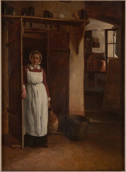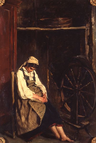 Editor: We're looking at Émile Friant's 1878 oil painting, "The butcher with his pipe and cat." The color palette feels very subdued, and I'm struck by the almost cinematic lighting. It reminds me a bit of a stage set, really. What catches your eye when you look at it? Curator: Well, first, let's just bask in the everyday beauty Friant captures. You know, sometimes the most profound art hides in plain sight. I find myself wondering about that cat! Look at the languid way it's stretched out, utterly indifferent to the butcher's work. It makes me chuckle – is that a comment on the working class, maybe? Or just a darn good observation? Do you think the cat could be a representation of comfort amidst labor? Editor: Possibly! I was so focused on the butcher himself. The details around the doorway fade into shadow while the cat seems to have found a sunny spot to nap. Curator: It certainly seems like the better place to be, doesn't it? Now, Friant was working within a time period obsessed with capturing "reality" in art – the Realism movement. I feel that the painting is offering something other than just a surface reality though. We are drawn into an emotional space with both of these figures as subjects that transcend time and place. It really leaves you considering your own everyday surroundings. I imagine he’s looking back as we are now! Editor: That's fascinating! The play of light and shadow really does give it a sense of depth, not just visually, but conceptually, too. Thank you for illuminating my view of this. Curator: My pleasure. I wonder if Émile had any idea we would still be here considering him and his rendering of that sleepy feline centuries later. What a pleasure, really, for all of us.