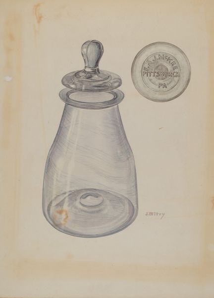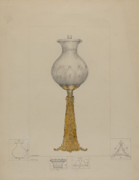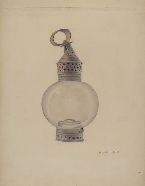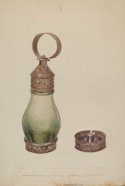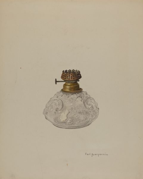 Curator: Let’s consider "Blue Glass Lamp," a work made around 1937, attributed to Helen Bronson. What catches your eye first about this drawing? Editor: The colour, definitely the colour. That deep, almost velvety blue of the lamp's base is so striking against the bare paper. It gives off a certain quietness, almost melancholy. Curator: It’s interesting you say that. Bronson created this drawing during a period when the United States was still emerging from the Great Depression, a time when material resources were scarce and blue glass represented attainable beauty. The availability of materials deeply influences the forms that artists create. Editor: Exactly. You see the marks of watercolour and perhaps oil pastel combined with the tinted ground – they really emphasise the textural contrast between the solid base and the fragile glass. And notice the etched, almost imperceptible decoration on the glass—it's meticulously observed, but not laboured. I think of craft guilds, apprentices mastering intricate details… Curator: The subject itself also speaks to the socio-cultural context. Oil lamps represent the transition from traditional domestic settings to the rise of the modern electrical home and symbolize knowledge, intellect, guidance, or a nostalgic longing for pre-industrial simplicity. Editor: In the making process, you imagine the artist having such an intimate relationship with this lamp. Looking closely, sketching, layering colours to achieve that depth… How does that shape our own consumption of this artwork, and lamps generally? Curator: Well, by elevating the image to a gallery context, we prompt a shift in value. The object is no longer purely functional but carries historical and aesthetic meaning, informed by how the art world positions it within certain discourses. Editor: Which brings up, what kinds of lamps would people consume, use, or encounter every day? Whose experiences are prioritized here? Curator: I agree. The material’s access and artistic interpretations highlight how social values intersect. This lamp’s representation signifies both its availability as commodity and its deeper role in cultural identity. Editor: So, looking at Bronson's technique and considering the history you've shared... I'm seeing this lamp, this moment, in a whole new light! Curator: Precisely! By exploring both form and content, we get a richer understanding of the artist’s vision.