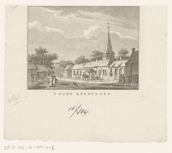 Carel Frederik Bendorp’s ‘View of the Village Sprundel near Rucphen’ is an etching with a tight composition of horizontal and vertical lines which structure the scene. Bendorp employs a structural arrangement that divides the landscape into distinct zones: the foreground with figures, the middle ground featuring buildings and trees, and the background dominated by the sky and a church spire. The textures, achieved through fine etching lines, create a subdued atmospheric quality that evokes a sense of quiet rural life. The artist uses a semiotic system of signs, where the church spire represents spiritual life, the figures signify community, and the natural elements symbolize the harmony between man and nature. These visual elements converge to reinforce traditional values of order, community, and faith. The composition's reliance on clear, rational spatial organization and subtle textural variations reflects broader artistic and philosophical concerns about humanity's relationship with the natural and social environment. This artwork challenges any fixed or singular meaning, inviting viewers to contemplate the interplay between representation, perception, and cultural values embedded within the image.