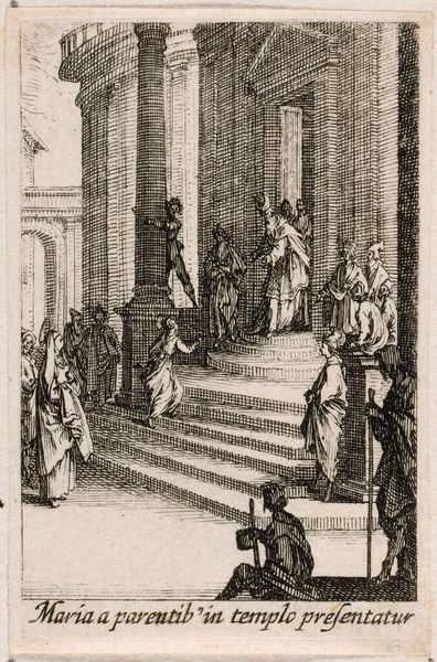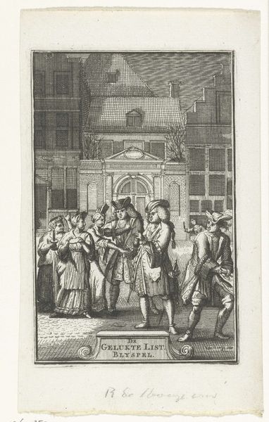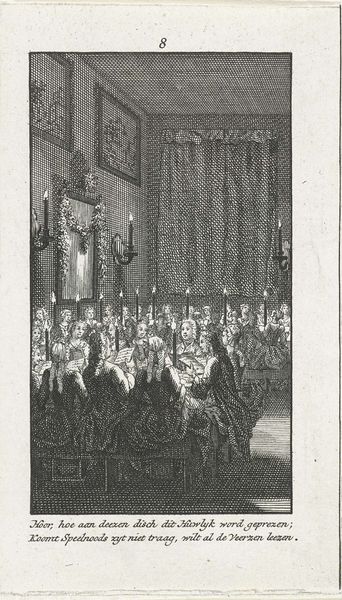 Curator: Here we have a Baroque engraving titled "Elegant gezelschap in een vertrek", created in 1712 by Bernard Picart. It's part of the Rijksmuseum's collection, a delicate print capturing a scene of genteel society. What’s your initial take? Editor: Intriguing! At first glance, I'm struck by the tension, almost like a dramatic pause in a play. The tight composition, the formal attire—it hints at secrets, doesn't it? All these layers, like looking into another dimension of social norms. Curator: Indeed. Picart was very interested in revealing what he thought was true. Genre-paintings like this offer valuable insights into the social rituals of the era. Notice the opulent interior, rendered with incredible detail through the engraving technique. The chandelier, the patterned floor—it speaks volumes about wealth and status. Editor: Right! You feel how that affects each interaction here? But beyond the material wealth, it feels performative. Are we invited or excluded, as viewers? There is no invitation for us to join that gathering. Curator: Precisely. And how do you interpret the figure presenting a document or letter? Editor: Hmm, perhaps that’s where some of that tension comes from. Perhaps a shocking announcement of debt? It disrupts their composed composure. The woman next to him gestures as though it's dreadful news... And she can only hint to it! It’s just incredible to have gotten all this from looking closely. Curator: That’s very insightful. These genre scenes are also commentary on the moral codes and social expectations that people were grappling with back then. The circulation of prints made art accessible to a broader audience, enabling the dissemination of ideas and social critiques. Editor: Yes, absolutely. Prints were such potent tools of communication at that time! It's mind-blowing to think about this image travelling, prompting questions and shaping opinions as it goes. Like the start of the meme era! Curator: I'm not sure Bernard Picart had any idea about memes when designing it back in 1712 but... looking at the bigger picture, he helped shape the tastes of people of his day, which is worth admiring. Editor: Agreed. A beautiful capture of human drama etched in time. I'll never look at engravings the same way again.