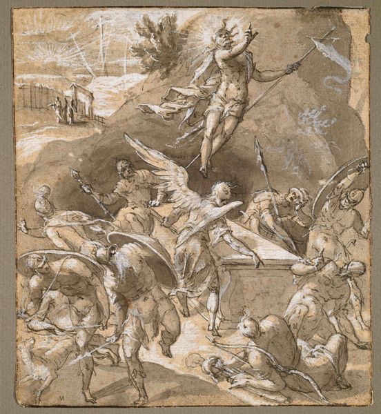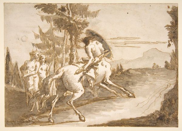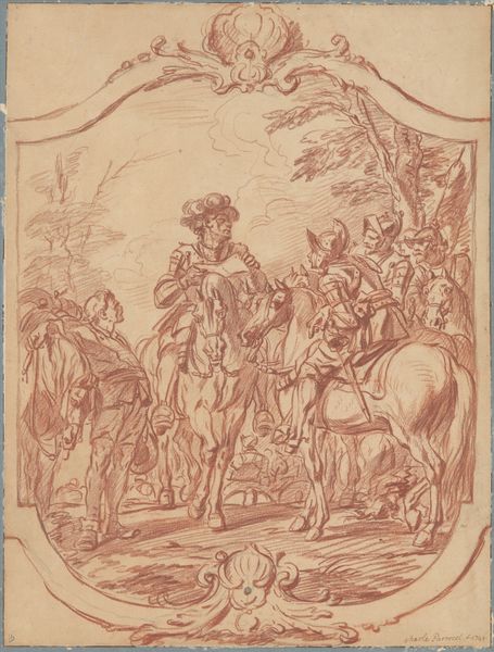Curator: Charles Parrocel, born in 1688, captured this scene, "Infantry Leader Receiving Battle Instructions from a Cavalry Officer," in what looks to me like a very urgent moment. Editor: The figures are indeed in a state of crisis. I am immediately drawn to the militaristic culture of the day, the violence, and the historical narrative of these power dynamics. Curator: It's just a drawing, but I can almost hear the snorting of the horses and the hushed commands. The artist's hand really brings the tension to life. It feels so immediate, a fleeting glimpse. Editor: The staging does feel very Baroque. The composition hints at the rigid hierarchies inherent in military structures and the complex dance of authority. Curator: Oh, absolutely! But there’s a touch of the theatrical here, too. The figures almost seem like actors on a stage. A silent play, if you will. Editor: Indeed, the drawing prompts us to question the glorification of war and its human toll. Even in this preparatory work, Parrocel's commentary on power structures is palpable. Curator: I find myself moved by the delicacy of the strokes and the very human element. There’s a real sense of vulnerability despite all the armor and aggression. Editor: The sketch opens an important discussion on the ways military campaigns have shaped identities, social structures, and the narratives we tell about ourselves. Curator: Yes. It's a moment frozen in time, but it resonates so vividly today. Editor: A piece that reminds us that art is always in conversation with history and ourselves.