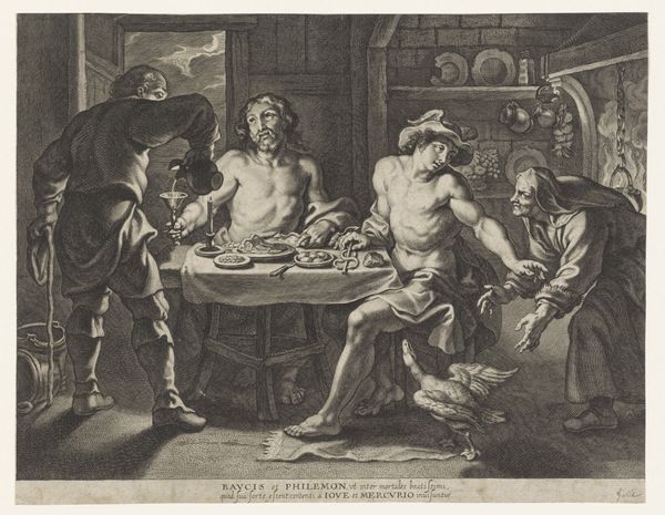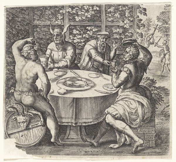 Curator: Let's turn our attention to "Bon Temps" by Pierre Brebiette. Created sometime between 1610 and 1642, this etching and engraving resides here at The Metropolitan Museum of Art. What are your first thoughts? Editor: Well, I immediately notice the composition. It’s overflowing with figures and objects; a slightly chaotic celebration, rendered in intricate lines. There's a definite sense of revelry, but also, perhaps, of impending… excess? Curator: Excess is key here! Look at the density of the hatching and cross-hatching. The artist's labor in creating this print seems to mirror the abundance depicted. He’s working with etching and engraving tools, manipulating the metal plate to produce this sense of rich texture. And consider the implications of producing it as a print. The work is made to be reproduced and widely distributed, amplifying its commentary about 'good times' to a larger audience. Editor: Exactly. And it's a very loaded image. We see what appears to be a depiction of Bacchus, or perhaps Silenus, crowned with grapes, a vessel of wine at the ready. The figures surrounding him – women, putti playing musical instruments – create this aura of pleasure and indulgence. I’m interested in the lute, how the woman looks, the expression in her eyes while playing this instrument. What this allegory attempts to portray! Curator: Musical instruments tie directly into questions of labor and patronage. Instruments like the lute were highly prized objects, products of specialized craft. Their presence here suggests both aristocratic leisure and the consumption habits that support these skilled artisans. "Bon Temps" isn't just about 'good times'; it is also subtly showing the infrastructure of production. Editor: That’s interesting. I see the symbolic dimension as dominant here, with the lute embodying harmony, not merely an aesthetic item linked to class but as part of the complete representation of good times. Also, I can't overlook that this is a rather explicitly sensual scene – the nude figures, the overflowing wine, even the close arrangements, all hinting to ideas around beauty standards of its time. Curator: But think of the economics involved in sustaining such lavish imagery. The artist depended on buyers, who in turn were benefiting from social and economic structures of the period. How complicit, perhaps, were people like Brebiette in the conditions he depicted? Editor: That brings an unexpected, new point of view into my understanding. So the scene’s joviality perhaps veils a deeper inquiry into luxury's cost! Fascinating! Curator: Precisely. "Bon Temps," viewed materially, provides a lens through which we can examine systems of production and exchange. It is through the creation of these works that we have material culture but is not simply an allegorical representation! Editor: Well, thanks to you, this print provides even richer levels to experience how symbols can still talk to audiences throughout art’s fascinating continuum.