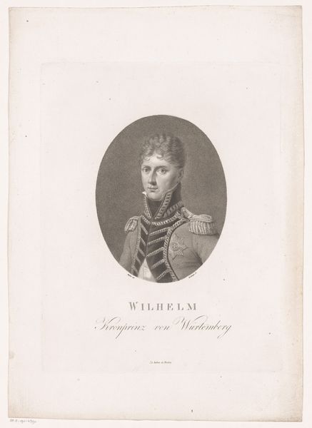 This is Wilhelm Heuer’s rendering of Prins Christian Frederik, an engraving. The formal composition consists of an oval portrait set against a rectangular backdrop, creating a dialogue between curvature and linearity. Notice how the subject's gaze directs our attention, engaging us in a silent exchange. The portrait's structure operates on binary oppositions, light and shadow, order and detail. The subject's face is illuminated to emphasize his features, yet intricate details of the uniform remain in shadow. This contrast establishes a visual hierarchy that leads the eye. The subject's youthfulness and composure is juxtaposed with the weight of his royal obligations. Heuer's technical approach, characterized by controlled lines and tonal modulations, elevates the subject while maintaining formal distance. This interplay between subject and technique invites a deeper contemplation on the nature of representation and power.