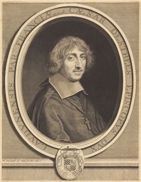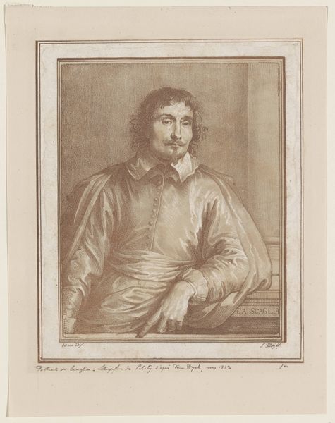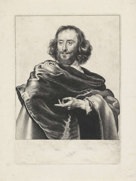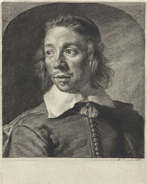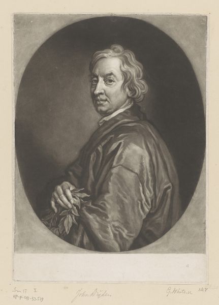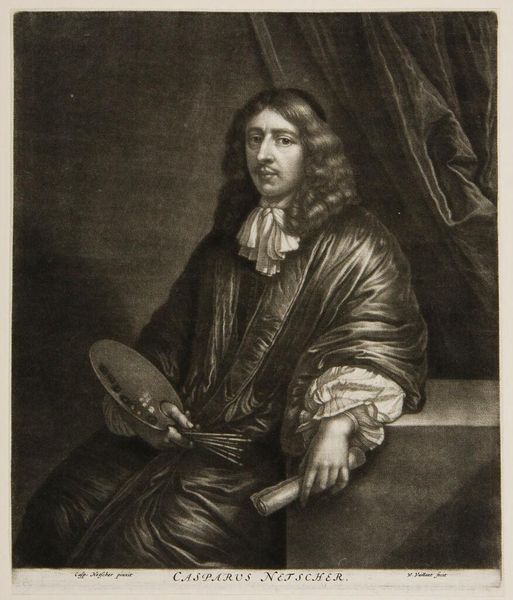 Editor: This is Sir Peter Lely’s portrait of Frans Mercurius van Helmont, housed here at the Tate. The muted palette creates a somber mood, but what stands out to you? Curator: The scroll in his hand is intriguing, isn't it? Consider scrolls as symbols of knowledge and communication. What cultural narratives might this object evoke, especially within the context of 17th-century intellectual circles? Editor: So the scroll could represent van Helmont’s own knowledge? Curator: Precisely. How might it reflect his standing within society, and what statement is Lely making about the subject through its inclusion? Editor: I hadn't considered how much objects contribute to our understanding of the sitter. Curator: Indeed, these visual symbols offer pathways to understanding the past.