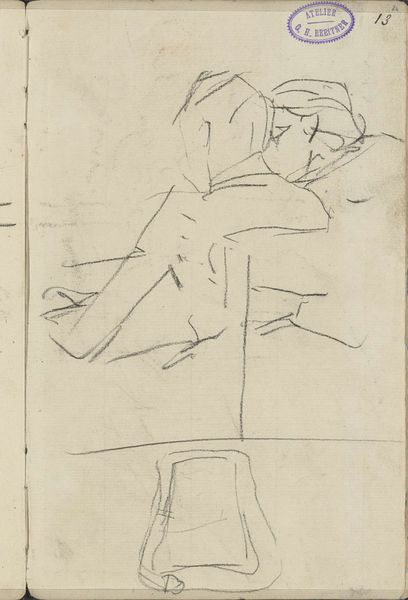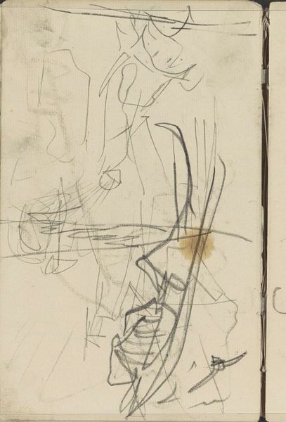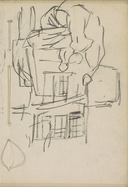 Editor: Here we have George Hendrik Breitner's "Vrouw met een voorwerp in haar handen", created between 1883 and 1885. It's a graphite drawing, a sketch really. I'm struck by the angularity of the lines, the way they define form without fully enclosing it. What catches your eye? Curator: The deliberate use of line is compelling. Note how Breitner employs hatching and cross-hatching, not for tonal accuracy, but to suggest volume and texture. The dynamism arises not from realistic rendering, but from the interplay of these intersecting lines, creating an almost sculptural quality within the two-dimensional plane. Consider the varying weight and direction of each stroke. What effect does that achieve, would you say? Editor: It's like he's capturing movement, even though it's a still image. The differing line weights emphasize certain areas, giving them more prominence. So, is it about abstracting form through line rather than representing reality? Curator: Precisely. The essence lies not in the mimetic representation of the woman, but in the formal relationships between line, tone, and composition. Semiotically, each line functions as a signifier, contributing to a network of meaning that transcends mere representation. We can see how the structural relationships between lines are more important than a perfect image of the model. The sketch's inherent ambiguity allows for multiple interpretations, challenging the viewer to actively construct meaning. Editor: So, by analyzing the bare bones of the artwork -- its lines and structure -- we see that it's more about capturing an impression than creating a perfect likeness. I see now how studying the "grammar" of the drawing gives it meaning. Thanks for your insights! Curator: Indeed. It's a reminder that art can communicate powerfully through its intrinsic elements, beyond superficial representation.