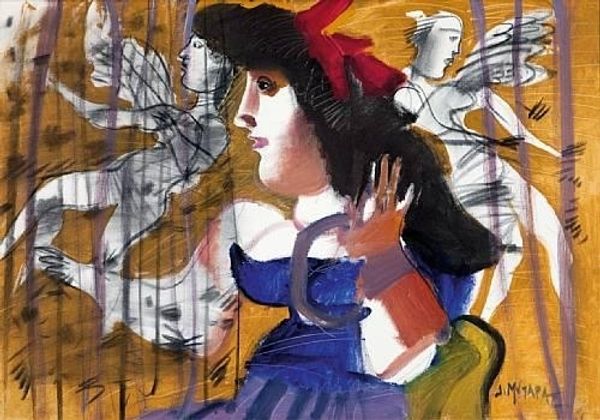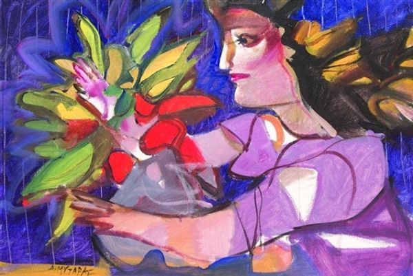 Dimitris Mytaras created this painting of a female figure, using bold colors and flattened perspectives. Its social context emerges from Greece, where Mytaras was a leading figure in the post-war artistic scene. Mytaras’s fragmented representation challenges traditional portraiture, moving beyond mere likeness to explore psychological depth. The influence of early 20th-century expressionism is clear, and this was an international style that often served as a form of social commentary. During this period in Greece, artists grappled with questions of national identity, cultural heritage, and the rapidly changing social landscape, partly through their affiliations with local museums and galleries. Mytaras’s female figure, therefore, reflects his participation in contemporary debates about gender, representation, and the role of art in Greek society. By consulting historical archives, exhibition catalogues, and critical reviews, we can continue to appreciate how this painting engages with the artistic and political dialogues of its time.