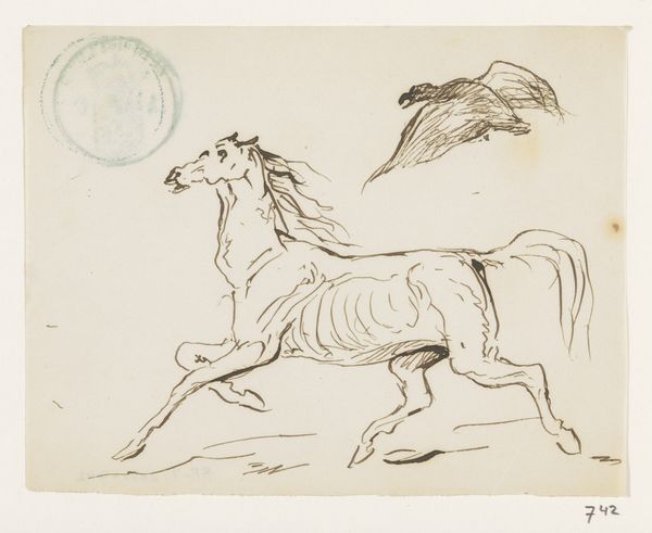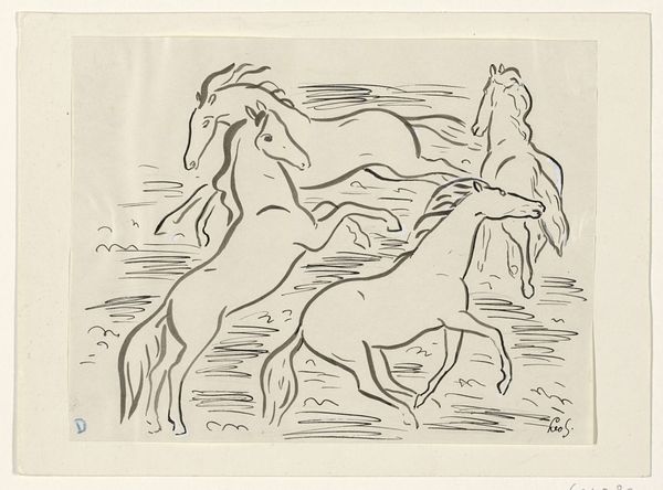 Editor: So, here we have "Studieblad met acht paarden," a study sheet of eight horses by Leo Gestel, made sometime between 1891 and 1941. It’s an ink drawing on paper, currently housed in the Rijksmuseum. What strikes me is how casual and spontaneous it feels – like a quick glimpse into a stable. What do you make of it? Curator: The interesting thing for me is how the "quick glimpse," as you say, naturalizes equestrian themes. During this period, we see the rise of industrialization altering human relations to animals. Artists are capturing leisure time, the rise of the sporting life, country escapes—things unavailable to vast segments of the population. Are these drawings records of the pastoral idyll or indicators of the shift in class structure at this time? Editor: That's a perspective I hadn't considered! So you’re saying that even a seemingly simple drawing like this can reflect broader social changes? Curator: Precisely! The prevalence of horse imagery, historically tied to aristocracy and power, also needs to be considered in relation to a democratizing art market. Who is consuming these images, and what desires are they fulfilling? Gestel is engaging with these questions, whether intentionally or not, simply by depicting this subject matter. Editor: It’s fascinating to think about how a seemingly simple drawing can be loaded with so much historical context. It’s made me appreciate the piece in a new way, beyond just the aesthetic appeal. Curator: Yes. Paying attention to how cultural and economic forces play out through artistic production helps us appreciate these works as more than just beautiful images, but also documents reflecting how people lived. Editor: Absolutely, I see that now. It's like peeling back layers of history. Thanks for opening my eyes!