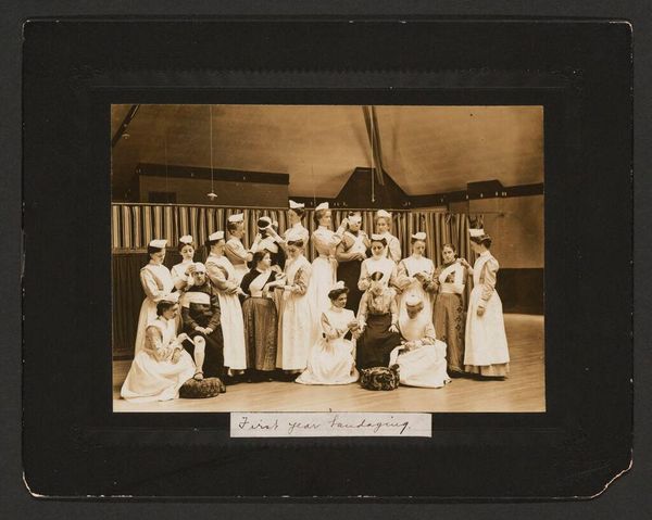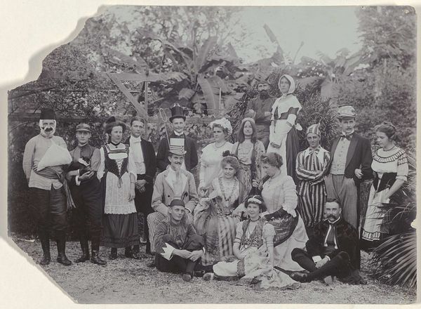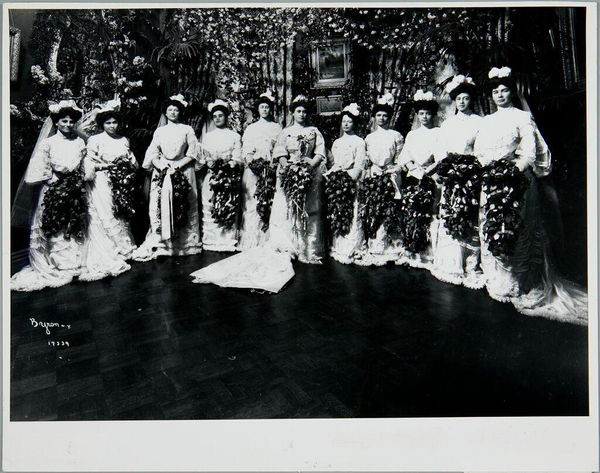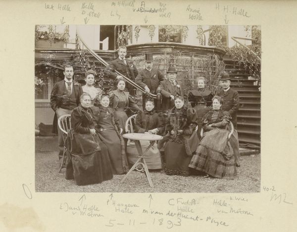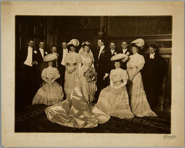 Curator: This is an untitled photograph by Martin Schweig, found at the Harvard Art Museums, which depicts a wedding party. Editor: It feels like a glimpse into another world, a bit sepia-toned and dreamy. Everyone's so formal. Curator: Right. The formality speaks to the social conventions of the time, a period where photography was becoming more accessible but still retained a sense of occasion. You see that in the staging and composition. Editor: And those hats! They’re practically sculptures. It really says something about the amount of labor and skill that went into creating even everyday items. Curator: Exactly. The photographic process itself, the choice of sepia toning, it all points to a specific set of material conditions and aesthetic choices, a desire for permanence and timelessness. Editor: It's kind of funny how timeless it seems, even though you can tell by the outfits exactly when it’s from. It's an interesting capture of a cultural moment. Curator: Indeed, a moment meticulously crafted through both social practice and material process. Editor: Seeing this has definitely given me food for thought.