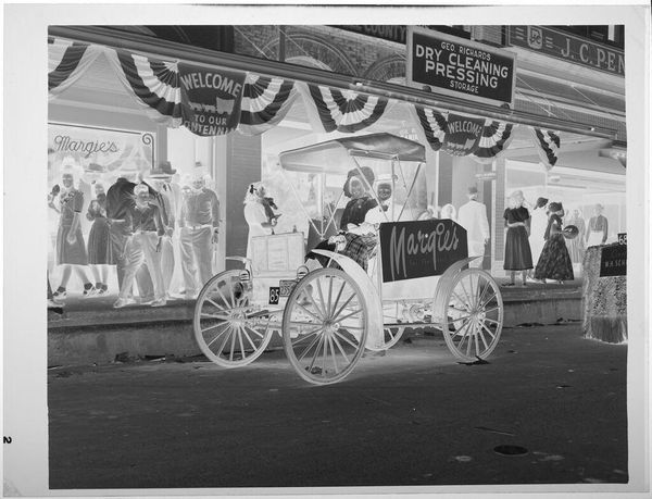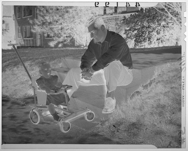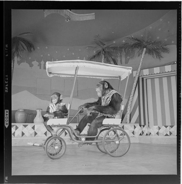 Editor: This is an untitled photograph by Jack Gould of a chimp and monkey on a cart. It feels so staged and artificial. What story do you think the artist is trying to tell? Curator: I see a focus on the means of production. Gould seems less interested in individual artistry and more in the social context of animal performance. Consider the labor involved in training these animals, the materiality of the props, and the consumption of this spectacle. Editor: So, you're saying it is less about the animals themselves and more about the system behind the performance? Curator: Precisely. It challenges our assumptions about the separation of high art and entertainment by showcasing the artifice behind the illusion. Editor: I see. It makes you think about the exploitation involved in creating this kind of "fun." Thanks for the insight.