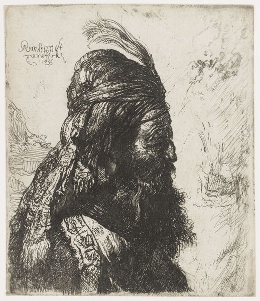Editor: Here we have Lovis Corinth's 1930 etching, "Goetz von Berlichingen." It's a powerful portrait, but something about the sketchy lines and stark contrast creates a really intense, almost troubled atmosphere. What stands out to you in this piece? Curator: Troubled is a great way to describe it, I think! Corinth really captured the essence of this historical figure. Von Berlichingen was a bit of a rebellious knight with an iron hand. You can almost feel his defiance radiating from the print, wouldn’t you say? The loose etching style almost mirrors his tumultuous life. I wonder if Corinth saw a bit of himself in that rebellious spirit? What do you think about the historical reference? Editor: That’s interesting, I didn't think about the connection between the artist and the subject! I suppose the etching, being a print, is more accessible, like von Berlichingen trying to be a man of the people perhaps. Curator: Exactly! Prints were revolutionary for that reason! And think about Corinth’s later life; grappling with illness, reflecting on his mortality. Von Berlichingen similarly faced adversity and found ways to persevere. Maybe it is that strength that really spoke to him, or at least me, eh? Editor: I can definitely see that now. Looking at the piece again, it feels less like a historical portrait and more like an exploration of resilience and maybe even a shared kindred spirit between the artist and subject, which I had missed entirely at the start. Thanks for that perspective. Curator: My pleasure, it's always wonderful to find unexpected depths within a piece and appreciate the story behind the art!
