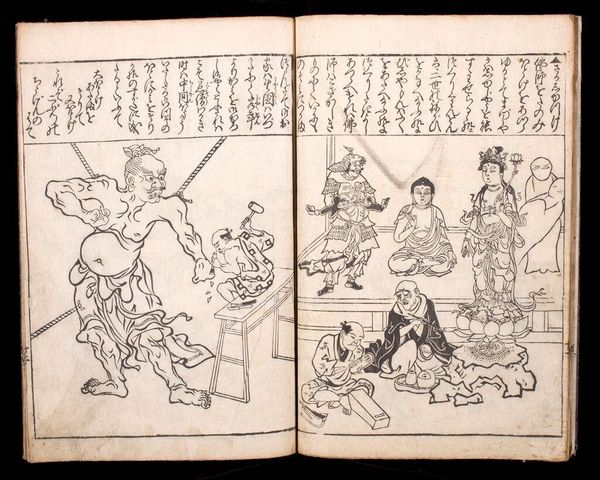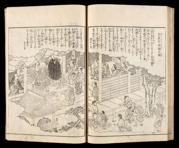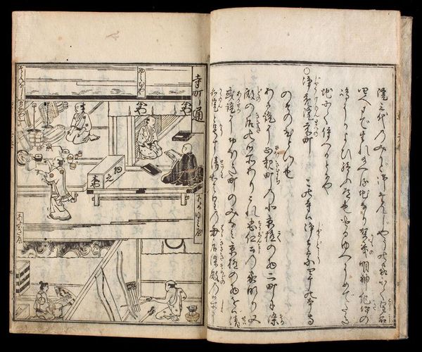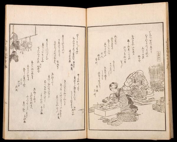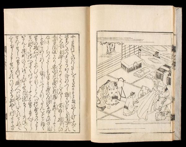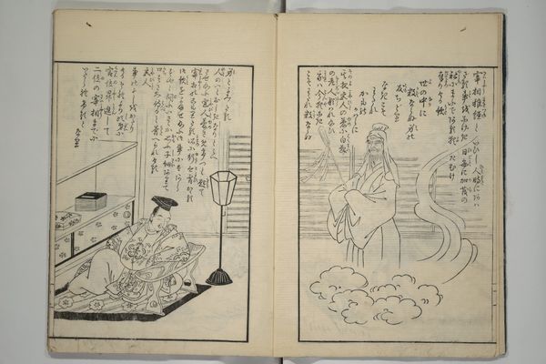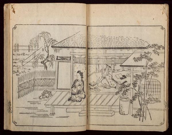 Curator: This is the first volume of Suzuki Harunobu's "Picture Book of Seasoned Grass: Waka by Famous Poets." Note the dimensions, roughly 22 by 16 centimeters. Editor: It feels immediately quiet, even melancholic. The monochromatic palette and delicate lines create a sense of hushed intimacy. Curator: Observe how Harunobu constructs the image with an interplay of geometric and organic forms. The stark lines of the floorboards contrast with the flowing robes. Editor: The figures, particularly the sleeping woman and the woman with a cup, evoke archetypes of rest and contemplation, maybe even sorrow. Is she longing for someone? Curator: The composition invites us to read the two scenes as studies in contrast, mirroring and disrupting each other through form and the graphic quality of the lines. Editor: The mirror reflecting the waves… that’s not just decor. It connects the interior space with the vastness of the natural world, hinting at deeper emotions. Curator: A fascinating dialogue between planes, lines, and curves. Editor: The artwork's beauty lies in its ability to evoke emotion through simple imagery.