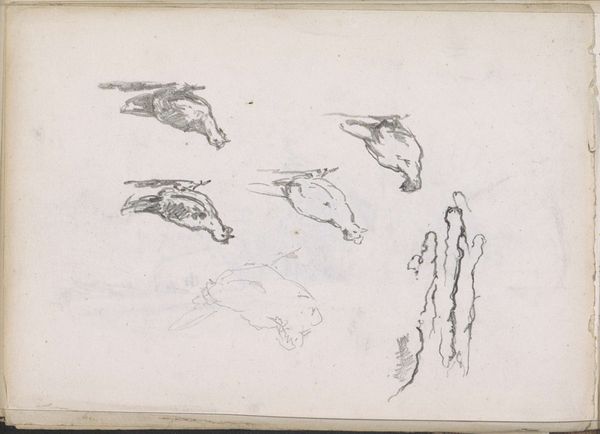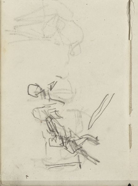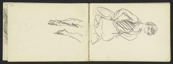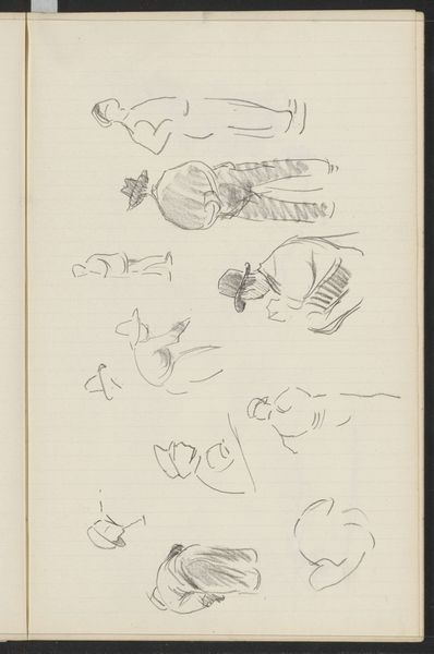 Curator: Looking at these graphite and ink drawings on notebook paper, what's your first take? Editor: There's an undeniable sense of playful energy, like a child's story board, almost slapdash in its composition but deliberate. What is this? Curator: Here we have a sketch, one that was made by Isaac Israels sometime between 1875 and 1934, called "Figuren in badkleding" or "Figures in Bathing Suits" here at the Rijksmuseum. Israels seemed keen on sketching people in motion, relaxing or doing sports. I would bet it shows how the changing landscape of leisure informed artistic expression at the time. Editor: Bathing suits… interesting. Considering how much swimwear has changed over the years, this feels less like documenting recreation, and more a comment on the human body itself. Look at how the quick, sure lines emphasize musculature and gesture—a timeless pursuit of the human form. The symbolism could very well refer to vulnerability and exposure. What do you make of it? Curator: Definitely, and I agree. There is a tension here. Leisure activities, of course, always had an aspect of gendered and class expectations. Swimwear has definitely symbolized changing attitudes to the body. But what resonates to me is the suggestion of voyeurism that lingers when viewing such scenes. One must then be prompted to analyze that unease when contextualized against the fact that this notebook might well be from his own personal sketchbook! Editor: Absolutely, what we bring to an image certainly shifts over time, with or without specific symbolic intent on the part of the artist! Curator: True. I think ultimately these loose sketches invite the viewer to meditate not only on recreation as seen in public but to think more privately, on our bodies, and our position in society. Editor: It all seems a bit fugitive, no? More feelings than details, I suppose that's the strength of sketchwork.