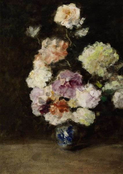 Curator: Today, we’re looking at Albert Dubois-Pillet’s "Flowers in three vases", an oil painting from 1879. The setting appears to be outdoors, characteristic of his *plein-air* approach to painting. Editor: My immediate impression is one of contained exuberance. The dark background really makes the bouquets pop, almost like they're straining to break free from the vases. Curator: Precisely! Dubois-Pillet painted this during a transitional time. Though he exhibited with the Impressionists, and his work aligns with their color experimentation, it has the composed sensibility we find in romanticism. Consider that as a military officer stationed in remote locations, finding camaraderie with fellow artists may have impacted his career choices and opportunities to exhibit more widely, influencing how his work was seen, especially considering his controversial social politics. Editor: Absolutely. I think seeing Dubois-Pillet outside Parisian circles complicates any easy label. The sheer density of the flowers feels deliberate too, pushing back at social mores. Flowers are always feminine objects, but he loads these arrangements with pigment and volume, a really assertive gesture. There's an inherent challenge in defining Dubois-Pillet within conventional narratives, particularly when examining his contributions and intersections across varying art movements and stylistic categorizations. Curator: The muted tones also depart from conventional notions of domestic floral art. I notice the interplay between the cultivation of flowers as feminine pursuit but presented without clear social expectations. The blooms don't need a dining table; they simply exist in an ambiguous area. He's using that tension in social representation. The lack of clarity asks viewers to reckon with broader conventions of identity, and our notions of what still-life and domestic arrangements signify. Editor: Agreed, he seems very much involved with the post-impressionistic search for authentic experience through visible texture and heightened color – it’s definitely there but not conventionally so. The choice of what vessels hold the flowers intrigues me. I keep wondering about the symbolism implied through their presentation. It’s more than just decorative arrangement. Curator: Well, it all comes back to the power dynamics inherent in art production and reception, right? To explore how shifting contexts shape artistic visibility and interpretations. Editor: Right, it also invites consideration around identity, gender, and race which ultimately adds enriching layers that expand our understanding beyond just an aesthetic pleasure. Curator: These considerations have changed how I view this oil painting now. Editor: It certainly adds depth and nuance to the experience!