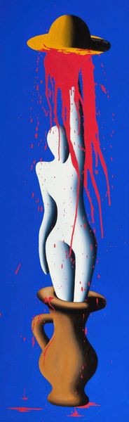 Editor: We’re looking at “Fan’s Club,” a contemporary acrylic painting by Nyoman Masriadi. The first thing that strikes me is how the artist renders the figure, particularly with that almost uniform, pinkish-red tone against the cool blue background. How would you approach analysing the visual impact of this work? Curator: We begin by examining its formal elements. The chromatic scheme immediately establishes a visual tension: a near-monochromatic figure contrasted with the solid, somber blue field. Consider how Masriadi uses the flatness of the colour to push figuration towards caricature. Notice the texture too - do you observe how flat the acrylic paint application is? Editor: Yes, it’s incredibly smooth, which seems to enhance that slightly unreal or hyperreal quality. I’m also wondering about the choice of boxing gloves combined with the provocative pose, along with "Masriadi Fans Club" written across her chest. Curator: Let's stay with form, for a moment. What impact do the boxing gloves have, given their relationship to the figure? Editor: The oversized red gloves act like compositional anchors. Their placement, mirroring each other on either side of the figure, creates a strong sense of symmetry, further emphasized by her stance and stare towards the viewer. Curator: Precisely! This symmetry provides stability, yet the implied violence of boxing gloves jars with the sensuality implied elsewhere. It presents an internal structural dissonance. It draws us in and creates an intentional visual contradiction to explore. The semiotics employed lead the eye through the contrasting colour-block, shapes and textures, revealing new visual stimuli, compelling the audience to unpack the artist's intent. Editor: I see what you mean. Looking closer, that friction is a core element. Thanks, that really helped me decode how Masriadi builds visual narrative using these formal tools. Curator: Indeed. Understanding the formal language enables us to engage with the complexities inherent within the visual framework, allowing us, as viewers, to explore its artistic nuances and form a much clearer response to the visual offering.