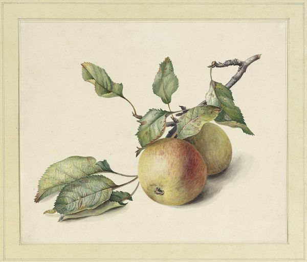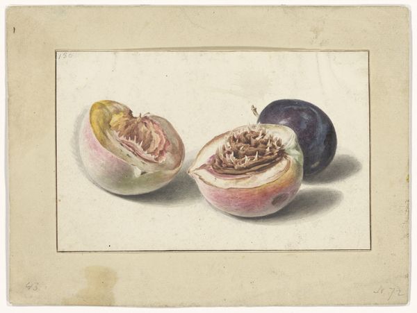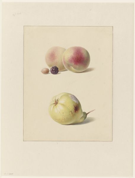 Curator: Here we have “Butterfly and Fly with a Peach” by Jacoba Maria van Nickelen, housed here at the Städel Museum. Editor: My first impression is a curious one. The composition is compelling, yet the mood is somewhat subdued. The grey backdrop makes the peach the obvious center, but something about it also feels…fragile. Curator: Indeed. While little is definitively known about van Nickelen’s biography, we can contextualize this piece within the broader development of still-life painting in the Dutch Golden Age, which saw the rising merchant class demand artwork celebrating their wealth and prosperity. The detail with which she has rendered each subject speaks volumes about her skill. Editor: Agreed. The texture is fascinating! Notice the rendering of light on the peach's surface and the way the leaf is rendered, veins and all. Van Nickelen skillfully manipulates tempera and gouache, creating subtle tonal gradations. Did this level of visual hyperrealism serve as a metaphor, pointing beyond immediate sensory experience? Curator: Absolutely. While superficially, the artwork celebrates natural beauty, we also know these still lifes often carry moralizing symbolism tied to earthly indulgence and mortality. We are urged to think critically about beauty. Notice the fly on the peach! Editor: It is an interesting presence… that subtle touch draws the viewer in. You begin to question the image you initially believed your eye had accepted as merely "pretty." The composition initially comes off very harmonious, however, now this simple fly shifts and alters the power relations, highlighting underlying complexities! Curator: Precisely! As museum curators, we contend with a similar process of interpreting artworks. What seems innocuous on the surface can often reveal a world of meaning when understood within its specific social, economic, and artistic context. Editor: Well said! And it reminds us how artworks are multifaceted... both reflective of their time, and suggestive beyond their time! It's a testament to Van Nickelen's art, managing to find some beauty in everyday images while raising many profound philosophical questions about perception.