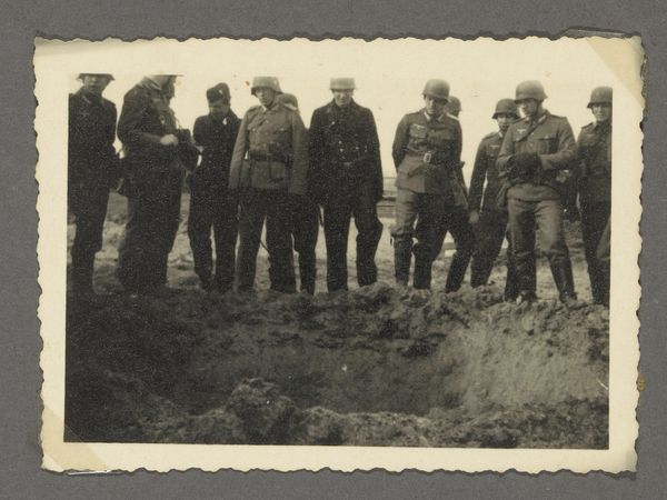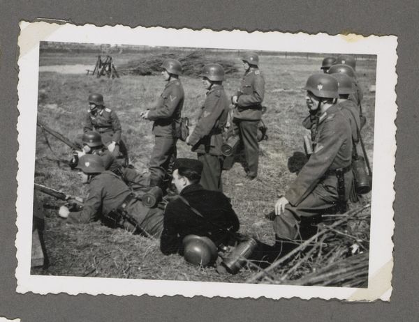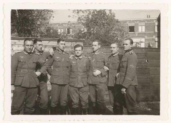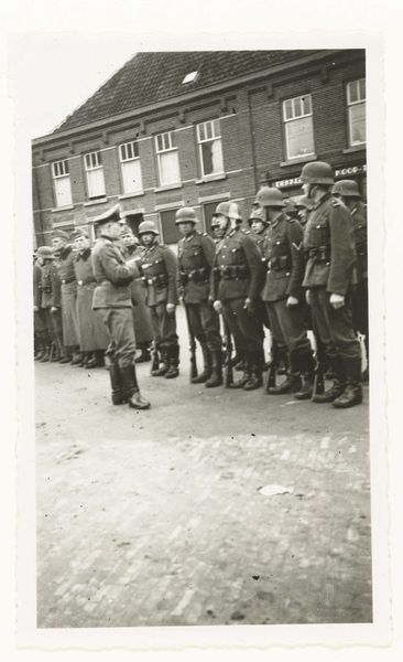 Editor: This photograph, titled "Groep militairen in uniform," was taken sometime between 1941 and 1945. It’s a gelatin silver print and the artist is listed as anonymous. There is something profoundly unsettling about seeing a group of soldiers lined up like this, seemingly anonymous and ready for orders. How do you interpret this work in its historical context? Curator: It’s unsettling for good reason. We must understand this image as a product and reflection of its time. Looking at their uniforms and the date, it's highly likely these are German soldiers during World War II. Consider how photography during this era was used as propaganda, reinforcing a specific narrative of power and control. Who was this image intended for? What emotions did it aim to evoke? Editor: So you're saying that this image may not be a neutral documentation, but instead a tool for constructing a certain image of military strength? Curator: Precisely. And that image, in turn, upheld a very specific ideological structure built on nationalism, racial supremacy, and military dominance. The soldiers themselves become almost dehumanized, represented as a uniform mass embodying state power, their individuality suppressed for the collective goal of war. Editor: It's chilling to think about the layers of manipulation embedded in this seemingly simple photograph. Did photography of this kind have implications beyond just Germany? Curator: Absolutely. Images like this circulated widely and played a significant role in shaping global perceptions of the war, fueling anxieties, and contributing to the broader political climate. We can think about the ethical considerations of depicting soldiers in uniform even today. Editor: It's interesting how a photograph, ostensibly meant to depict reality, can be such a potent tool of ideological manipulation. It has implications far beyond the purely aesthetic. I definitely see this work in a new light now. Curator: Exactly. Questioning these power dynamics is crucial to understanding the work, not just as a historical artifact, but as a cautionary tale about image making.