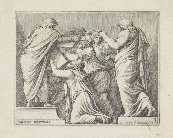 Curator: This etching is titled "Apollo and Diana Attacking Niobe's Children," by Giovanni Battista Galestruzzi, who lived from 1615 to 1669. Editor: It’s stark, isn't it? The shading is so sharp; it feels almost theatrical. Like a tragedy unfolding on a rocky stage. Curator: Absolutely. Galestruzzi captures a pivotal moment from Ovid's Metamorphoses. The goddess Niobe, after boasting of her superior fertility to the goddess Leto, suffers the wrath of Leto's children, Apollo and Diana. Editor: The woman on the left, shrouded in shadow, must be Niobe. She looks both terrified and resigned. You can feel the weight of her hubris, the impending doom. A heavy cloak of grief. Curator: Yes, and the dynamic poses of Apollo and Diana readying their bows emphasizes the swift, merciless divine retribution. A powerful lesson in humility. Editor: Right. Makes you wonder about the stories we tell ourselves, the ones we believe too much. Curator: Precisely. Images like this resonate because they tap into timeless themes of pride, envy, and the consequences of challenging the established order. Editor: Well, now I'm wondering what stories *I’m* telling myself... Curator: Perhaps we all should, from time to time.