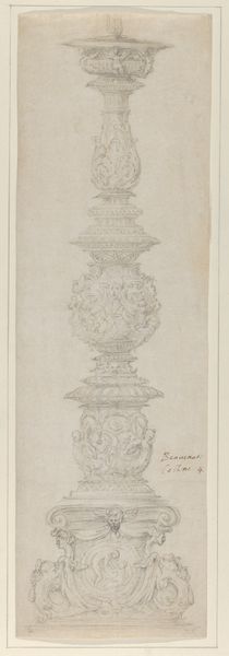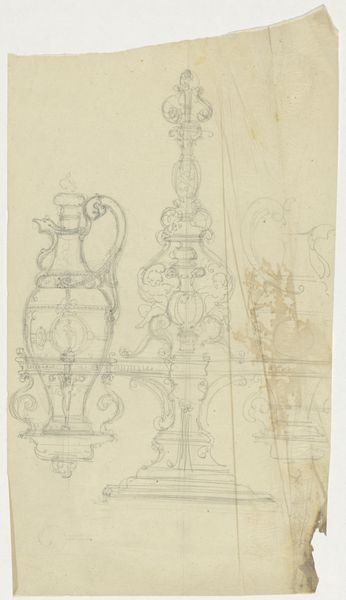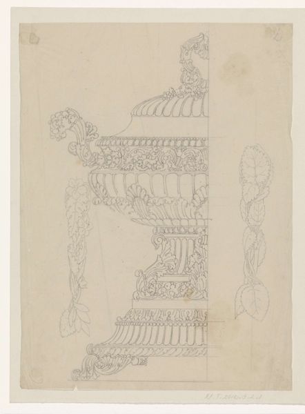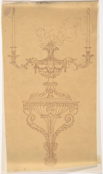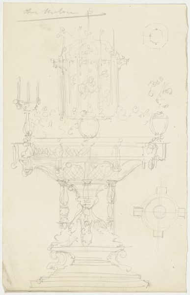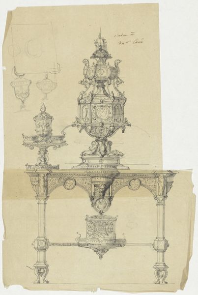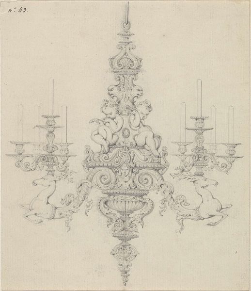 Curator: This is a pencil drawing entitled "Vuurbok," attributed to Firma Feuchère, dating from around 1830 to 1850. The medium offers a unique perspective on form. What catches your eye first about this piece? Editor: It has a kind of rococo charm but feels fragile, doesn’t it? Like a memory sketched on parchment, those cherubic figures leaning so casually…almost melancholic amidst the flourishes. Curator: Interesting, 'melancholic.' From my point of view, the very details of production are what fascinate me. Consider that Firma Feuchère likely produced this not as a finished piece but as a design blueprint. We’re looking at a drawing for what would eventually be manufactured, perhaps cast in metal. Editor: So, a plan, not the thing itself. That changes my reading of it! I thought it was meant to evoke tenderness with that graphite smudging... but now it feels… more utilitarian. Although, even within a factory context, those hand-drawn lines still carry an echo of artistic sensibility, don’t they? Curator: Precisely! And notice the careful delineation, almost like an engineer’s blueprint. The pencil, a relatively inexpensive material, becomes the tool to potentially create an elaborate, costly object. We also see a breakdown of hierarchy: the drawing might be ‘lesser,’ but without it, there's no manufactured object at all. Editor: You’re right; the medium undermines any pretense. Thinking about the cherubs… their nonchalant poses almost mock the grandeur they're meant to embody. I also can’t help but wonder, did some apprentice work on the legs while the master sketched the figures? Curator: That's insightful. Division of labor is crucial here; each hand imparts its mark. Even though the design originates with Firma Feuchère, the process is collaborative. The 'Vuurbok,' seemingly opulent, stems from mundane work, various sets of hands shaping the form. Editor: So it is simultaneously ephemeral and enduring. Thanks, I think I'm looking at it differently now. I love when art does that. Curator: Absolutely. Considering the context changes our perception entirely; the means shape how we understand its form and value, or rather, its lack thereof!