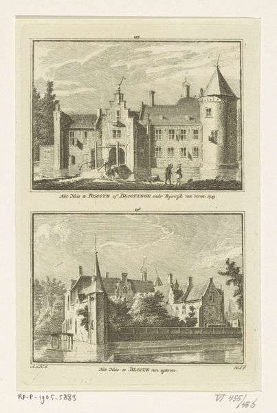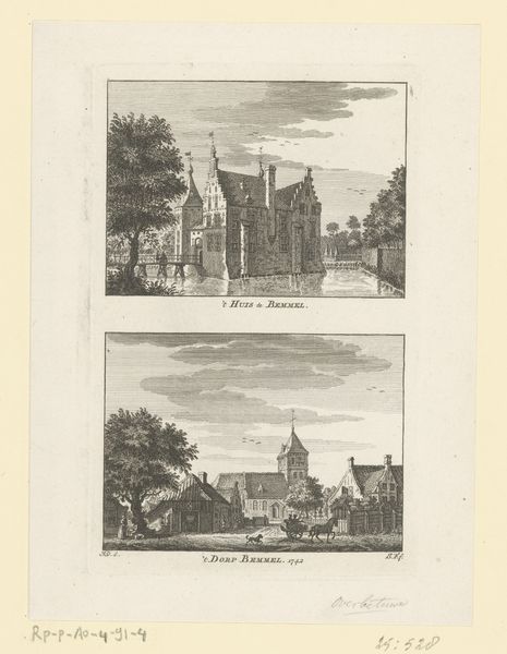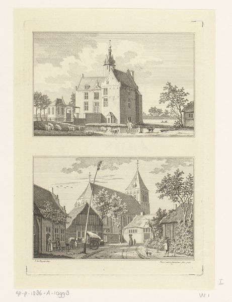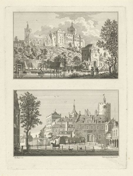 Curator: Immediately, there’s something so orderly, almost meditative, about the neatness of these engravings. Editor: Indeed! We are looking at "Gezicht op de Amsterdamse Poort en gezicht op de Neckerpoort te Purmerend," or Views of the Amsterdam and Necker Gates in Purmerend, created sometime between 1757 and 1792 by Hendrik Spilman. It's fascinating to observe these cityscapes immortalized through printmaking. Curator: "Immortilized" is the perfect word. There’s a sense of… suspended animation. A breeze couldn't rustle those leaves, you know? I imagine Spilman meticulously etching each tiny line, holding the world still. Editor: The Dutch Golden Age aesthetic is palpable, particularly in the almost scientific precision with which Spilman renders these architectural structures. The gates become symbols of civic pride and commercial power. Did these function more as welcoming points of trade or points to control access? Curator: You know, my eye is drawn to the people. Tiny figures in each scene, strolling, chatting… It brings a lovely human dimension to it all. I imagine them discussing, gossiping, carrying on with the minutiae of daily life, entirely oblivious to their grand architectural surroundings. Editor: Or perhaps the architecture defined their daily existence? City gates dictated movement, commerce, and even social interactions. The gates become more than pretty pictures. The architecture is not merely picturesque. This work encourages us to examine how urban structures shape society. Who gets in and out? Who controls the passage? Curator: Absolutely. I adore how this seemingly simple work unlocks so many complex layers! The interplay between art and life. Editor: Indeed! It reminds us that every line, every shadow in art, tells a story about us, our history, and the structures, both physical and ideological, that shape our existence. Curator: Well said. And now, looking at it again, it seems it also speaks of memory and mortality. Because things might never be the same after we are gone. Editor: A vital consideration indeed! Thanks for guiding us to deeper connections.