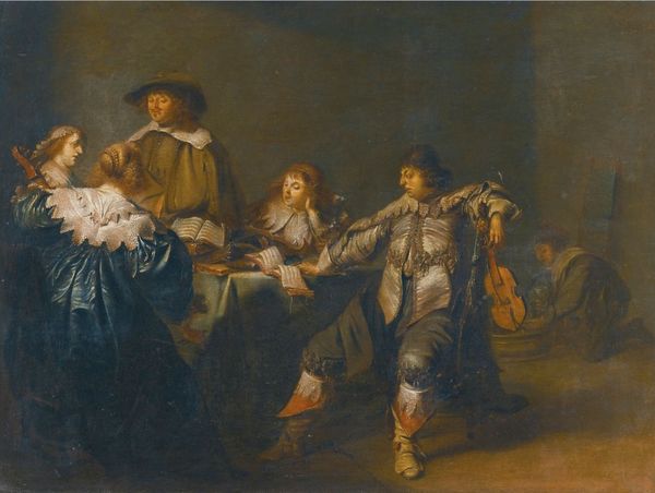 Curator: Ah, the sheer exuberant joy in Dirck Hals's "Merry Company on a Terrace"! Painted around 1625 using oil paints, it's like a perfectly captured slice of 17th-century revelry. Editor: Yes, the figures positively vibrate with life! There's a wonderful lightness despite the formal dress. It's a symphony of texture and saturated hues -the velvety fabrics, those incredible hats, the light catching on the cello's varnish... but beneath that is perhaps some tension between the extravagance and... well, something. Curator: Oh, I love that you feel the tension! It’s precisely that sense of fleeting pleasure that makes it so engaging. Each character, seemingly lost in their own musical world, yet subtly aware of being observed by both the artist and us centuries later. There is that younger child though that seems lost in another activity though. Editor: You’re right, they’re posing for an unseen audience as much as enjoying themselves. The placement, the terrace, and those dramatic costumes: it all recalls theatrical stages. Baroque art often features people playing different roles in real life and within their portrait. It gives me a glimpse into a highly stylized and theatrical society, but also asks questions about authenticity and identity. Are they showing off or simply comfortable within social constraints? Curator: It also reflects the emerging wealth and merchant class during the Dutch Golden Age. The details on the ruffs, for instance, show that meticulous craftsmanship – it symbolizes their financial standing, their status. I see it as almost a self-portrait of a culture defining itself through leisure and art. But what symbol speaks most powerfully to you here? Editor: It's subtle but the lute strikes me most. Lutes and other instruments symbolized harmony, not just of sound, but of social order, of love and partnership. The fact that these players are literally instruments of merriment makes them, in a way, tools or ornaments as well as individuals. They have their roles to play, visually and musically, and create one pleasing impression through joint performance. Curator: Beautifully said! I now sense their interdependence. When first viewing, I had seen them only as unique persons. "Merry Company on a Terrace", so then, as both individual story and a wider reflection on an era—a playful melody concealing a subtle meditation on human nature and social roles.