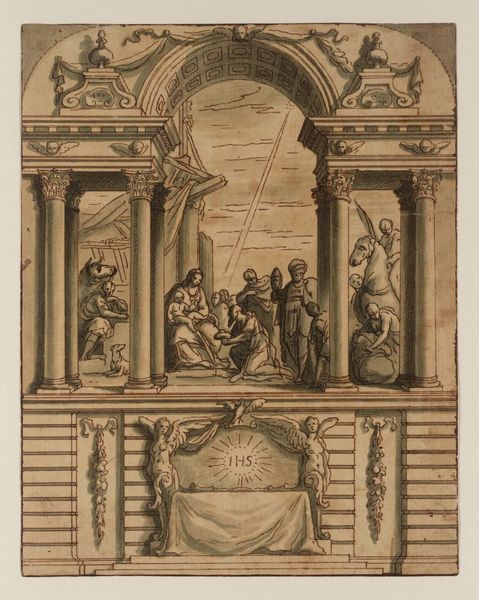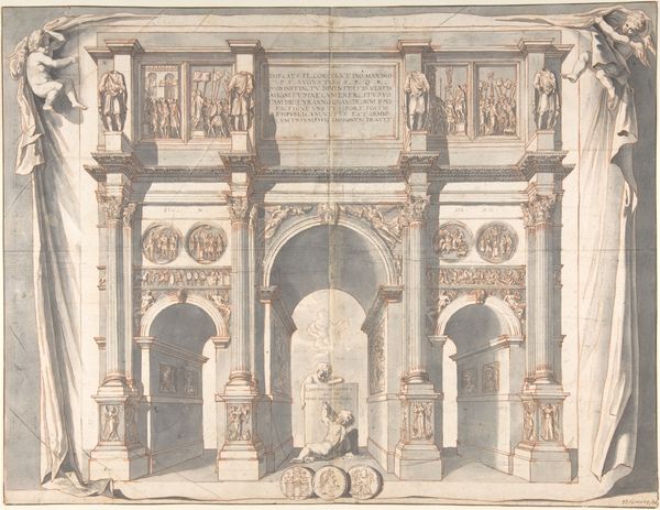In pen, gray wash, and red chalk, Jan Goeree depicted a reconstruction of the Aerarium above a view of its ruins. The Aerarium, or treasury, in ancient Rome, was not only a repository for public funds but also a symbol of Roman power and governance. Goeree, working in the Dutch Republic, engages with a long tradition of Northern European artists looking back to classical antiquity. What's striking here is the way Goeree presents both the ideal form of the building and its present decayed state. This juxtaposition speaks to the 18th-century fascination with the cyclical nature of civilizations, rising to power and then falling into ruin. To understand Goeree’s image, one can look to contemporary architectural treatises and archeological records, popular at the time. These resources provide insight into how artists and scholars of the period understood and reimagined the classical world. This image reminds us that our understanding of history is always mediated through the cultural lens of the present.