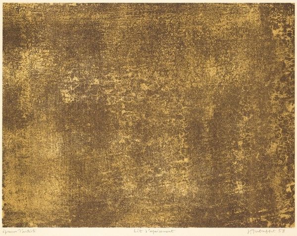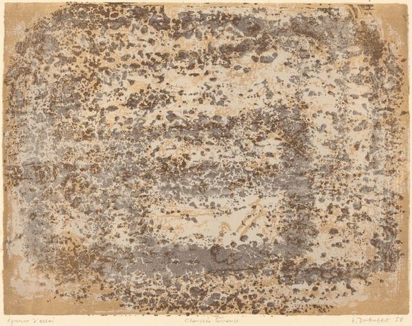 Curator: Well, hello there! This print absolutely vibrates with the energy of Jean Dubuffet. It’s called "Jeux d'ombre," created in 1958. What’s your first impression? Editor: I'm struck by how… oppressive it feels. Like staring into a brown fog that threatens to envelop everything. Curator: Oppressive, huh? I feel something more ambiguous. It reminds me of landscapes, and yet it's clearly abstract. Do you think that's intentional, this kind of landscape-that-isn't-quite-a-landscape? Editor: Dubuffet emerged after the Second World War, a period marked by deep-seated disillusionment and social upheaval. The density and monochrome palette could mirror that sense of despair. Abstraction as a way to avoid direct representation, perhaps? Curator: Exactly! It feels to me like the imprint of something traumatic—memories clinging to consciousness, almost but not quite making sense. He moved away from the conventional "beauty" and I wonder, was this maybe his protest? Editor: Absolutely, against academic tradition and also societal norms. The "shadow play," jeux d'ombre in French, is fitting. What's concealed versus revealed? In whose shadows are we standing? How does the establishment participate in hiding truth, creating shadows? Curator: True. And look at the texture he achieves with lithography! A chaotic jumble, like the stuff of the subconscious made visible. Raw, almost violent, wouldn’t you say? I almost see bodies and faces but as fragmented visions, phantasms, afterimages... Editor: Indeed, he seems to confront conventional understandings of beauty by centering a brutalist aesthetic—making viewers uneasy by portraying an aesthetic of refuse, of discarded matter. And while appearing chaotic, that feeling actually reflects a meticulous layering of meaning. Curator: Layering that invites us to confront, as he often did, the raw, unfiltered realities of existence and question all preconceived notions of art and culture. A bit much, don’t you think? Editor: Maybe! Still, Dubuffet challenges us, even now, to reflect on our own relationship to societal shadows. What a call to action. Curator: Yes, definitely food for thought in contemplating how he blurred the line between art and life, in such an unsettling and powerful way.