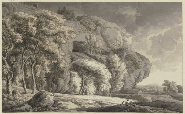 Franz Kobell created this 'Rocky Mountain Landscape' using pen and black ink with gray wash. Dominating the composition are the towering rock formations, rendered with meticulous detail. The artist uses the wash to model forms, creating a sense of depth and volume. The dark lines and textured surfaces create a compelling interplay between light and shadow, evoking a sense of awe and the sublime. Consider how the arrangement of elements guides your eye through the landscape. The juxtaposition of the rugged rocks and the softer foliage creates a balanced yet dynamic composition. Kobell uses the landscape to explore themes of nature, beauty, and the power of the natural world. The careful rendering of textures invites a sensory engagement with the scene, allowing viewers to almost feel the rough surfaces of the rocks and the delicate leaves of the trees. This piece stands as a reminder of the enduring appeal of landscape as a vehicle for artistic expression. Each stroke and wash contributes not only to the aesthetic appeal but also to a deeper exploration of our relationship with nature.