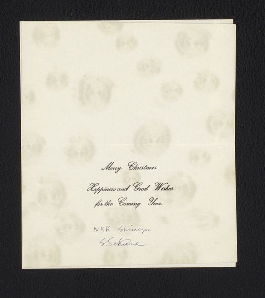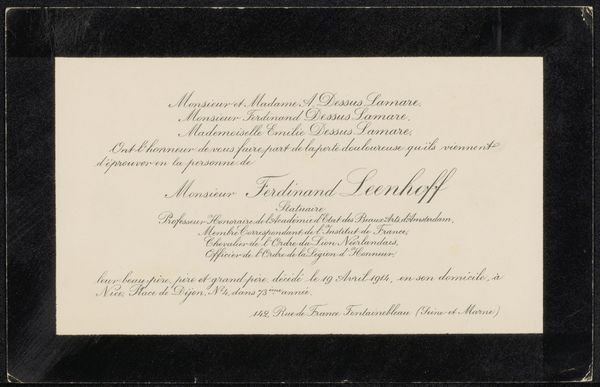 Editor: So, this is a wedding announcement to Philip Zilcken, created before 1908, artist is Anonymous. It's such a delicate, calligraphic piece. How can we interpret the social relevance of something so seemingly personal? Curator: Well, the beauty of these ephemera lies in their ability to reveal societal norms and values. Notice how Monsieur Alexandre Charpentier’s professional achievements – "Statuaire, Chevalier de la Légion d'Honneur" – are prominently displayed. This reflects the importance placed on social standing and artistic accomplishment within the bourgeoisie of the time. Editor: It’s almost like a resume preceding a joyous event! Were such announcements typically so… credentialed? Curator: Precisely! The announcement serves not only to inform, but also to solidify and broadcast the couple's place within the cultural and social hierarchy. Consider the intended recipients: undoubtedly members of their own elevated circles. This card becomes a symbol of their status, reinforcing those societal structures. Editor: That’s fascinating. I had initially overlooked the self-promotion element. It shifts my entire understanding. I wonder how the Art Nouveau style factors into this as well? Curator: The elegant Art Nouveau lettering further emphasizes refinement and good taste, reflecting the cultural aspirations of the educated elite. Art, even in typography, serves to define social identities. What have you gleaned from looking at this piece in a different light? Editor: I never thought a wedding announcement could offer so much insight into the socio-political dynamics of the period. I’m definitely going to look closer at how art functioned as a marker of social status.