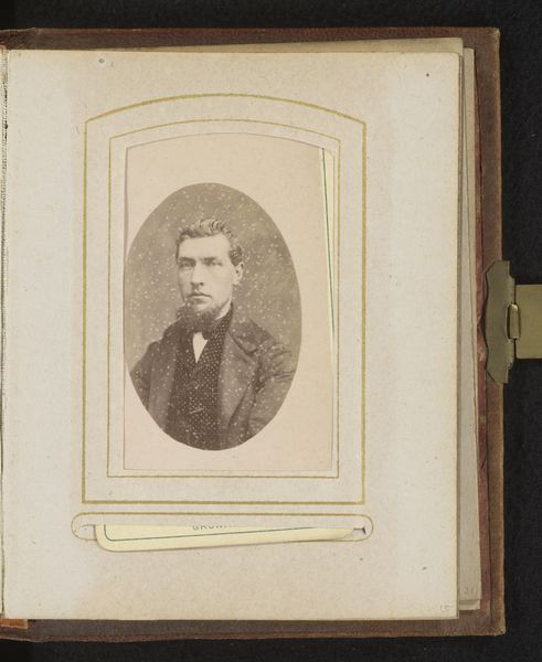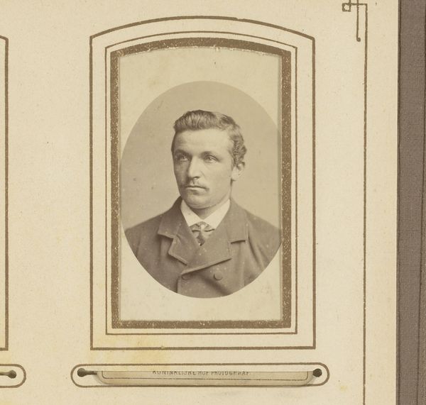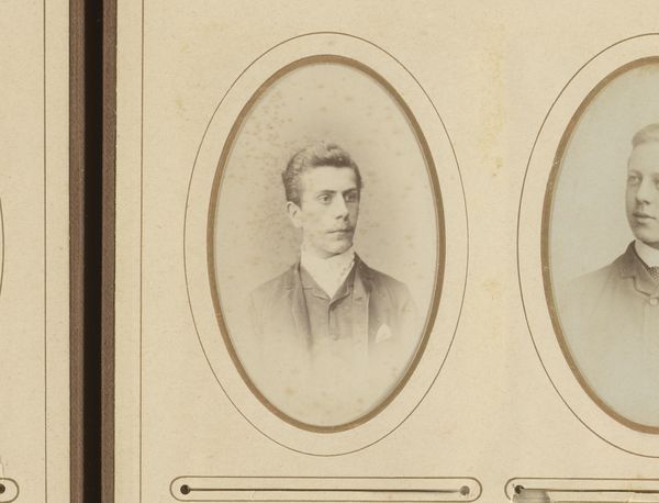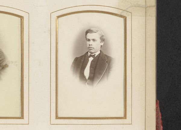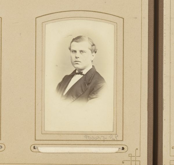 Curator: Oh, he's got that "first dance" look, doesn’t he? A touch awkward, undeniably sweet, and hoping nobody notices his sweaty palms. Editor: Indeed. Here we have a photographic portrait from somewhere between 1868 and 1900 by Adrianus van Beurden titled "Portret van een jonge man met vlinderstrik"—"Portrait of a young man with a bow tie". The formal composition and sepia tones root it firmly in that late 19th-century Romanticism movement. Curator: Right? It feels like stepping into a time machine. He’s frozen there, in that perfect moment of being almost a man, still clinging to boyhood, maybe? You can almost feel the heavy wool of his jacket! Editor: Observe the subtle nuances within that sepia palette. The high contrast renders sharp delineations between planes, highlighting texture and form, but there is also a softness, especially around the oval vignette. The composition emphasizes verticality, the sitter framed centrally, drawing attention to his face. Curator: I keep coming back to that expression. He's holding back a smile, I think. Maybe a touch nervous under all those layers of respectability. Is it just me, or is there also something terribly modern in his gaze? It’s like he is right here, right now. Editor: What you perceive as “modern,” I interpret as an artifact of Romanticism—that exploration of human emotion and the inner self through visual expression. Note how the photographer manipulates light to subtly sculpt his face, guiding your eyes to those emotive focal points, capturing perhaps a fleeting glimpse into the subject's psychological space. Curator: See, that's what I love about these old portraits! They were meant to show how things were, but instead, they hint at how things felt. Like all these formal poses couldn’t completely tame that glimmer of mischief or sorrow lurking under the surface. Makes you wonder what stories this bow-tied boy could tell. Editor: Yes, art transcends its intrinsic materiality by imbuing within the viewer a deep and palpable curiosity of form and matter, and a sentimental connection through time.